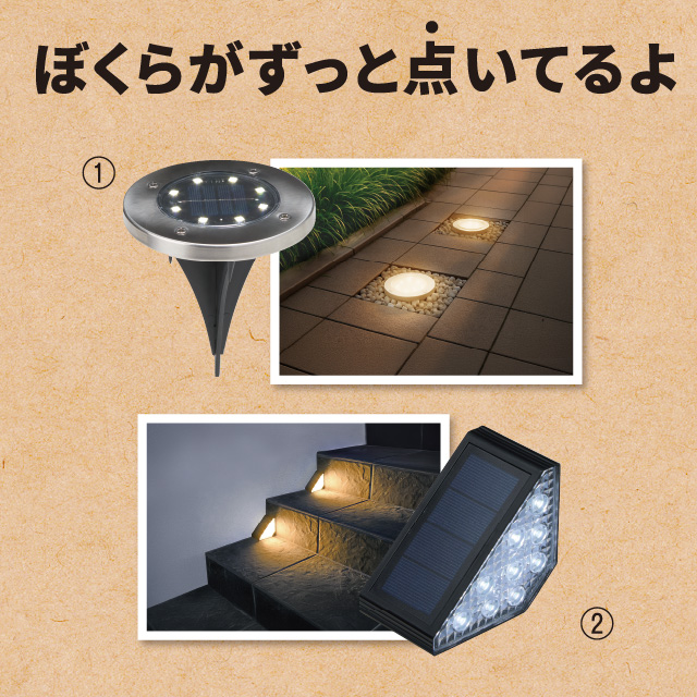 ①埋込タイプ昼白色/電球色②ステップタイプ昼白色/電球色昼間に充電して暗くなると自動で点灯!夜間ずっと明るいので、庭や外階段の防犯、足元の安全対策にもおすすめです。