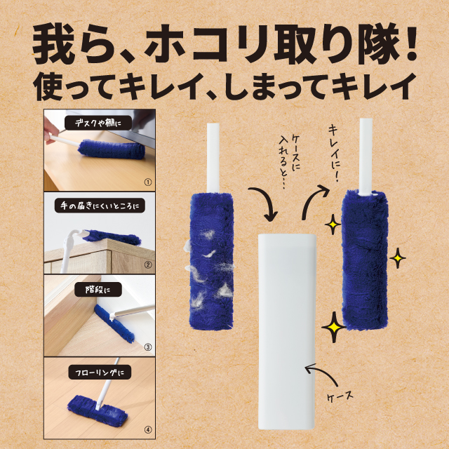 ①ハンディモップ②ハンディ伸縮タイプ③ワイパー 階段用④ワイパー フローリング用場所に合わせて使い分け!取ったホコリはケースに入れるだけでケース内のスポンジが回収するのでくり返し使えます。溜まったホコリはケースを開けてまとめてポイ!
