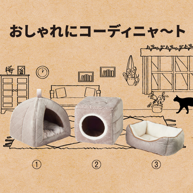 ①ハウスベッド約幅40×奥行40×高さ40cm②2WAYハウス約幅35×奥行35×高さ35cm③スクエアベッドS 約幅50×奥行40×高さ20cm落ち着いたカラーでインテリアにも馴染みます!ふわふわの触り心地で、猫ちゃんのお気に入りの場所に。