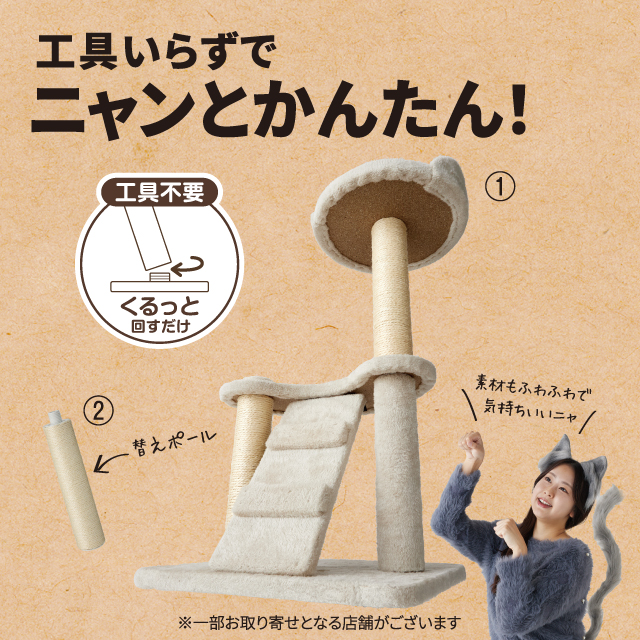 ①ステップタイプ約幅42×奥行36×高さ72cm②替えポール約直径6.5×高さ30cmくるっと回すだけで簡単に組み立てできる!つめとぎポールはボロボロになったら交換可能です。(別売)