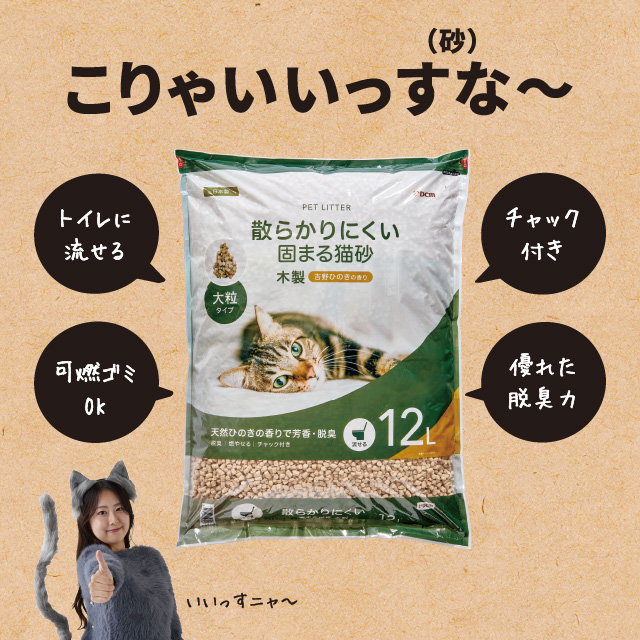 木製 大粒タイプ 12L吉野ひのきの香りと木の消臭作用でニオイを軽減。ほこり立ちも少なく、汚れた部分だけしっかり固まります。大粒ペレットだから猫ちゃんの足にもくっつきにくい◎