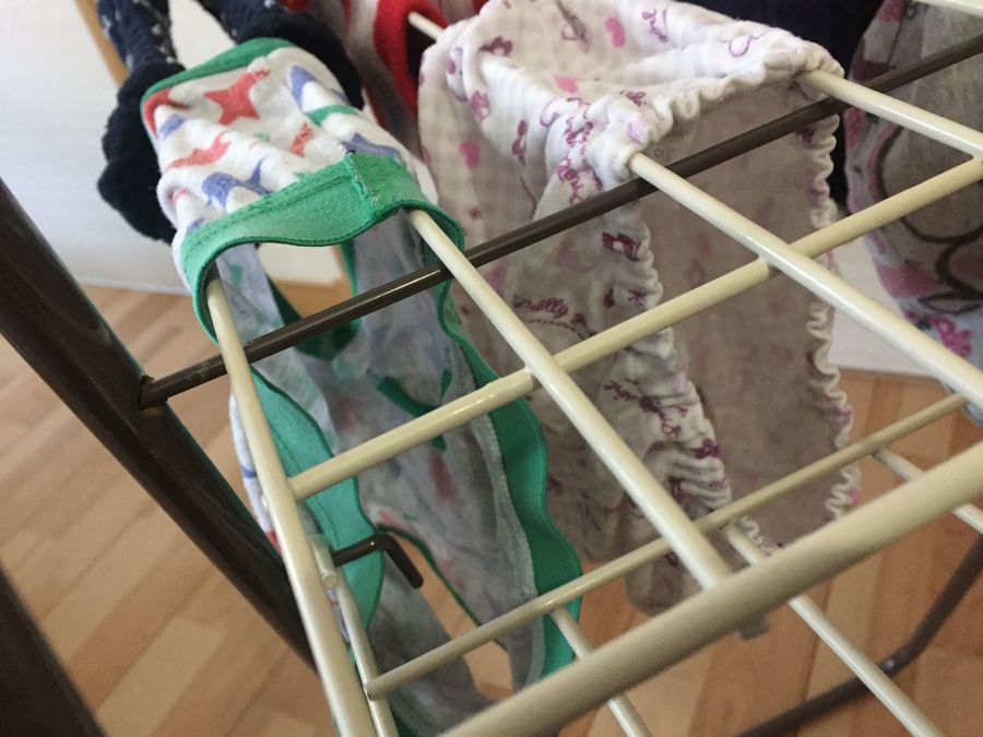 パンツもこのように干します。バー2つ分にまたがって、隙間を開けて干すことで、ぐんと乾きやすく。