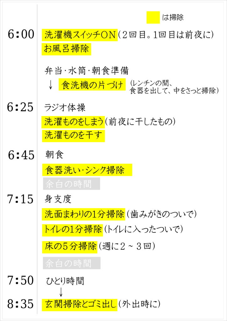 ただ掃除をすればいいという訳ではありません。思い付きで動いていると、朝時間はあっという間に無くなります。効率よく動くために、まずは段取り表を作りましょう。