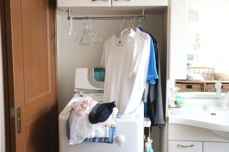★洗濯ものを干す洗面コーナーへきたついでに、洗濯機から洗濯ものを出し、ハンガーにセット。DIYした一時掛け用のポールにかけ、作業をしやすくしています。休みの日は外干し。仕事の日は部屋干し。雨の日は浴室乾燥機へ入れます。