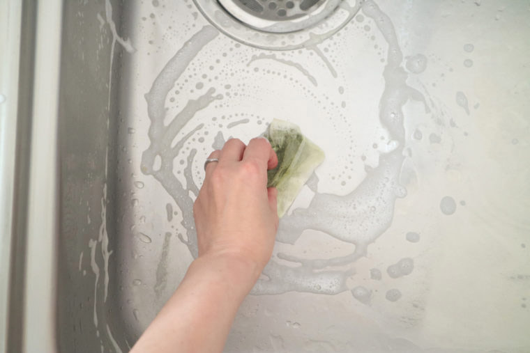 ★シンクの掃除食器を洗ったついでにゴミ受けを空にして、シンクの中をさっと磨きます。ラップ、お茶パック、皮などをスポンジ代わりに。