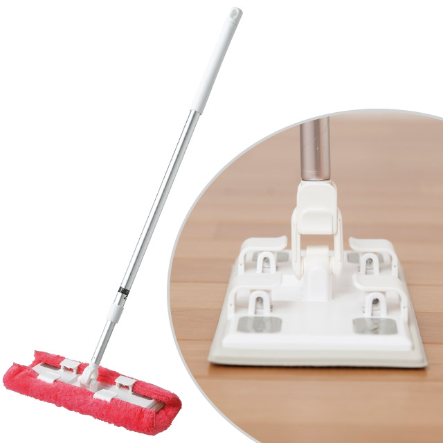 フローリング用シートとぞうきんが使えるクリップ付きフローリングワイパー。柄は約75~110cmに伸縮可能。