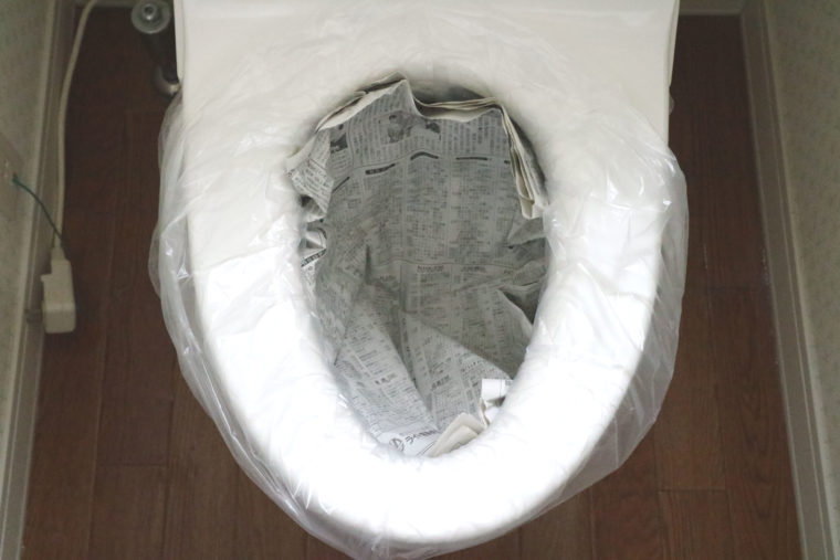 破損や断水で排水できないとき、汚物は袋に入れて処分します。トイレ本体を利用すると便利です。