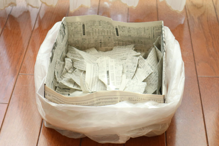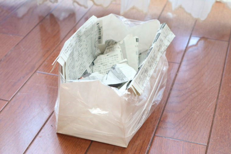 ・ポリ袋の中に、新聞紙で作ったゴミ箱をセット。・中に凝固剤やちぎった新聞紙などを入れる。・使用後は、袋の口をしっかり縛り、処分する。