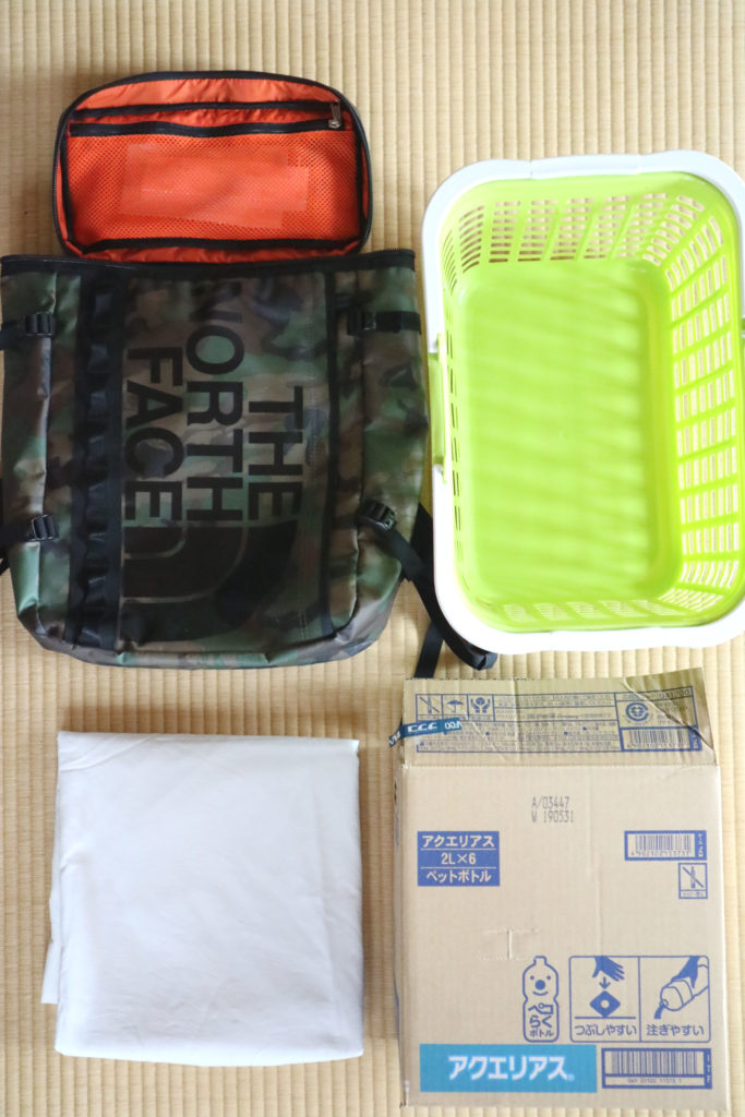 給水タンクの他に、リュックなどのバック、カゴ、丈夫な段ボールも利用できます。