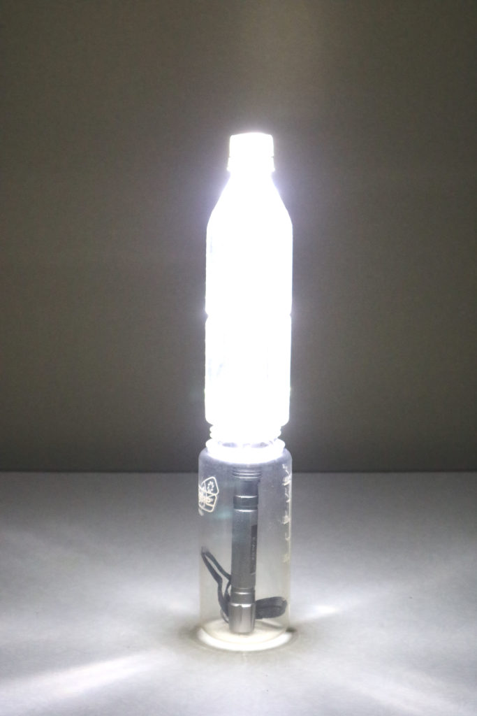 【方法】・懐中電灯を立てる(細い場合は、容器で固定)。・水をいれたペットボトルをのせ、下から照らす。