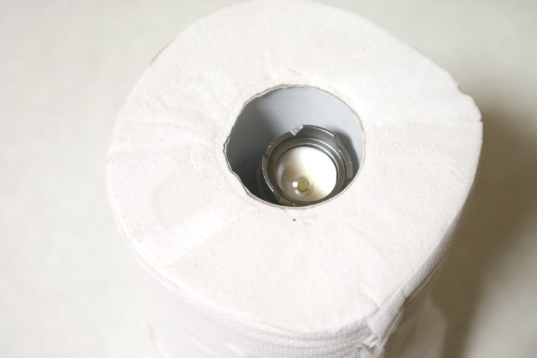 固定する際、トイレットペーパーも使えます。2個重ねて、筒底にペーパーを詰めれば、長い懐中電灯もぴったり。