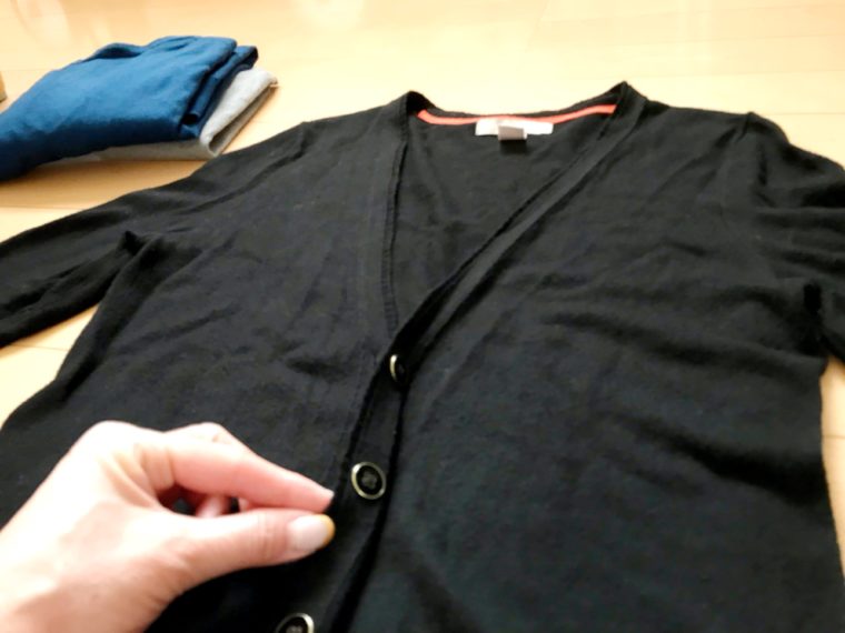 カーディガンはボタンを留めず重ねるだけで大丈夫。タートルネックは先にネック部分を手前に折ってから上記と同じようにたたみます。トレーナーも同じように。Tシャツも袖が短いだけで、たたみ方は同じです。