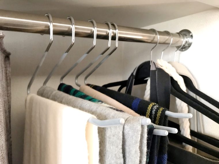 例えば引っ掛けるだけのスラックスハンガー は掛けるのも取り出すのもラクなのでストールやマフラーの収納にも向いています。