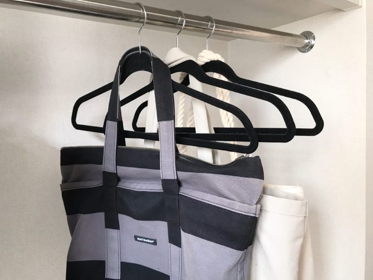 バッグの持ち手をハンガーに通せば、バッグを吊るして収納することが可能になります。シワになりやすい素材や自立が難しいバッグなどはこうして吊るしたほうがラクな場合もありますね。