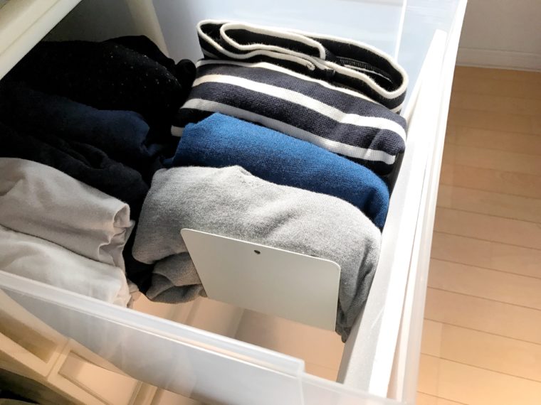 カットソーやニットなど引き出しにたたんで入れた洋服は、立てて入れると選びやすくていいですよね。でも洋服って柔らかいから自立せず、すぐに倒れてしまうのがストレスに。引き出し式の場合は開け閉めのたびに倒れるなんてこともあるんです。そんな時にはブックエンドを支えに使ってみて!倒れそうな洋服をしっかりホールドしてくれるので倒れるストレスは感じません!好きな位置にセットできるのもブックエンド収納のいいところ!量の増減や洋服の厚みに左右されず、いつでも最適な場所でしっかり洋服を支えてくれます。