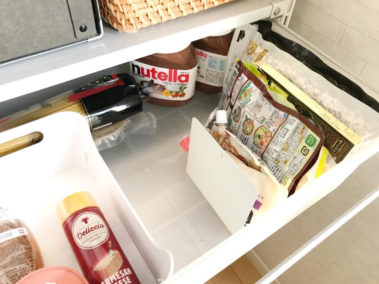 お菓子にレトルト食材、乾物の袋にふりかけの袋……など、食材ストックには不安定な形のものが実に多いと思いませんか?これらもブックエンドで支えて、きっちり立てる収納にすれば取り出しやすく見つけやすい収納ができますよ!立てて収納することで全体量を把握することができますし、あるとわかれば、二重買いも防げますよね。