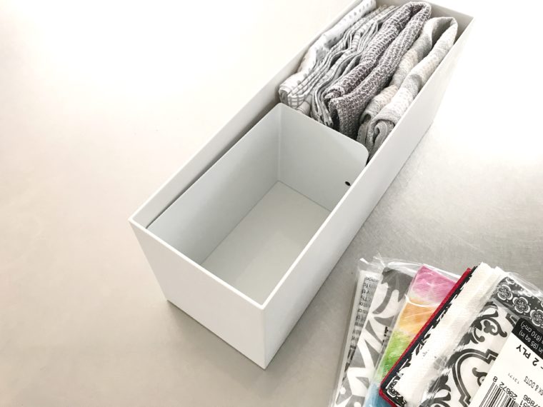 ボックスの中にブックエンドを入れて、ふきんとペーパーナプキンを仕切って収納しています。ブックエンドを使えば、空間を簡単に仕切ることが可能!ひとまとめにすると混ざってわかりにくいものも、ブックエンドで種類別に分けることで、取り出しやすくて戻しやすい収納が実現します!