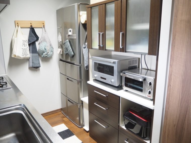 普段の食事で使う食器は、食器棚上段の開き戸のところとシンク下の引き出しの中に収納しています。ここは、どちらも高さ的に取り出しやすい場所なので、忙しい時でもストレスなく準備ができます。