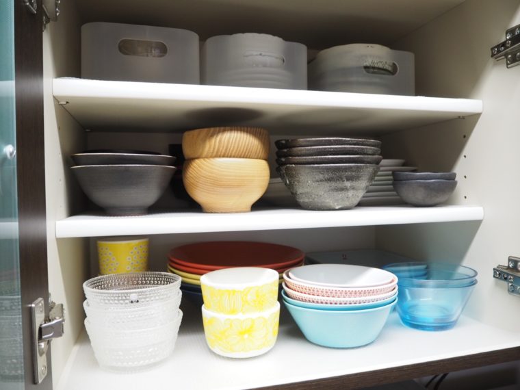 高さ的に取り出しづらい食器棚上段は、ボックスを使ってさっと取り出せるように工夫しています。こちらは毎晩使うわけではありませんが、たまに必要になる時があるのでそんなときには役立ちます。