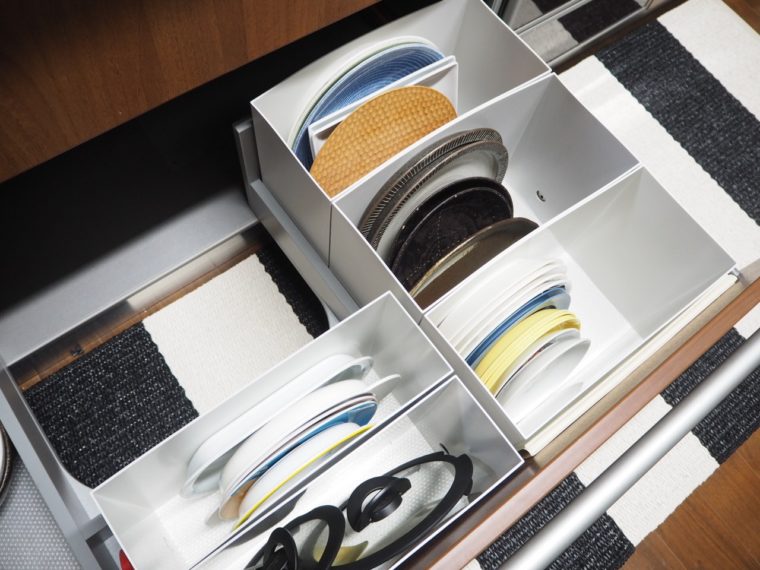 シンク下の引き出しはファイルボックスを使って、プレート類やお鍋のフタなどを立てて収納。プレートは重ねてしまうと取りたいお皿を出すまでに時間がかかるので、立てる収納がワンアクションで取り出せて便利です。