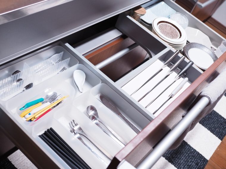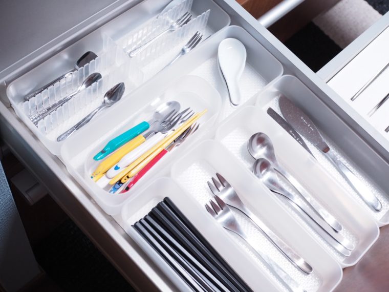種類別の分け方の他に、「子供用カトラリー」はさらにボックスを分けてまとめてあります。こちらはボックスごと食卓に出すことで、腹ペコの子供たちが勝手に自分で取って食べ始めてくれます。これもちょっとの工夫ではありますが、毎晩のことなので「ママ、おはし!」といちいち呼ばれずに済むのは時短につながっています。