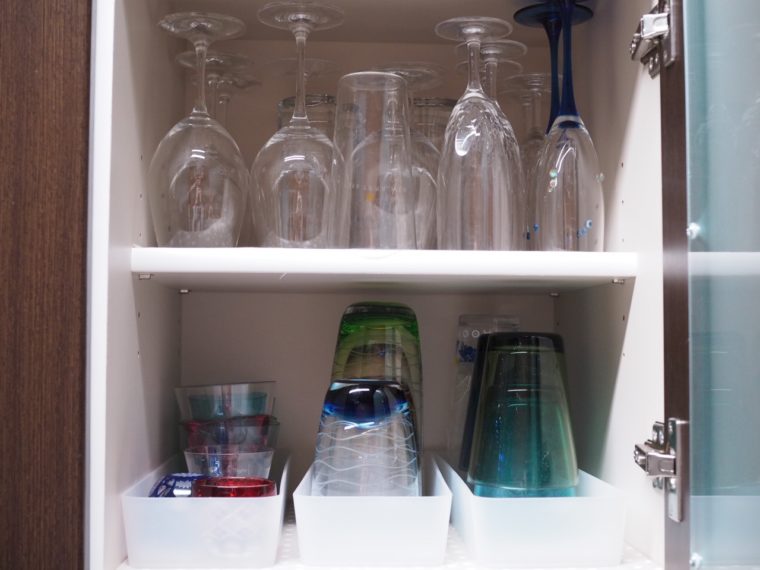同じように、食器棚のグラス収納のところにもボックスを活用しています。これを使うことで、奥のグラスもボックスを引き出すだけでさっと取り出せるためとても便利です!以上、我が家の食器収納の工夫についてのご紹介でした。忙しい夕食時ですが、すぐに取り出せる収納が整っていると少しでも時短に繋げられてストレスフリーにできますよ!ぜひ真似できそうなアイデアがあったら取り入れてみてくださいね。