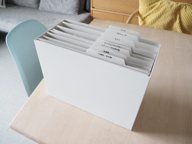 上の写真は我が家の取扱説明書の収納ですが、ファイルボックスに個別フォルダを入れてラベリングすることで探す時間が大幅軽減できました!