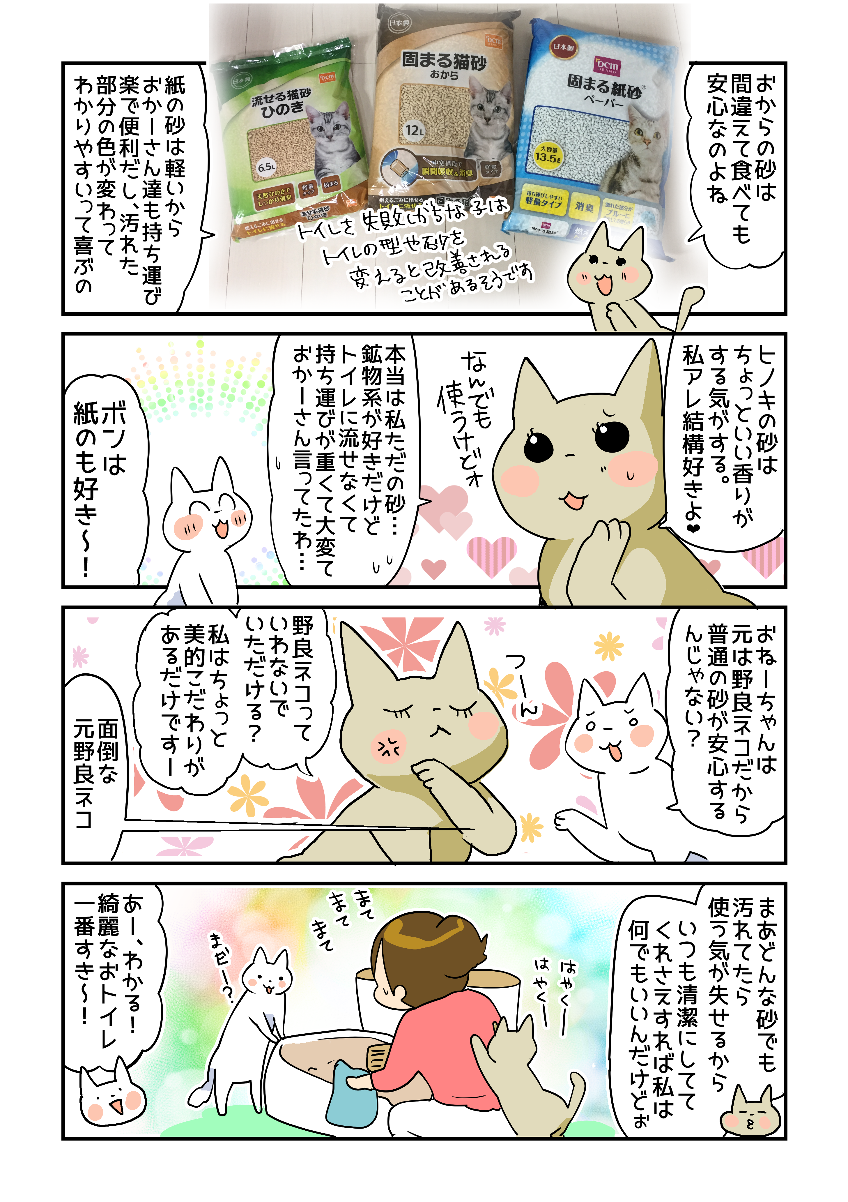 DCMさんの紙&おからの猫砂は、しっかりおしっこを吸って固まってくれるので、拾いやすくて処理がとても楽でした~!紙の方も、色が変わるのでとっても便利!多頭飼いには大容量タイプってすごく助かります。どちらも猫たちがトイレ後にしっかり砂かきして隠してくれれば、1日外出して帰って来た時でも室内のにおいが気になりません!