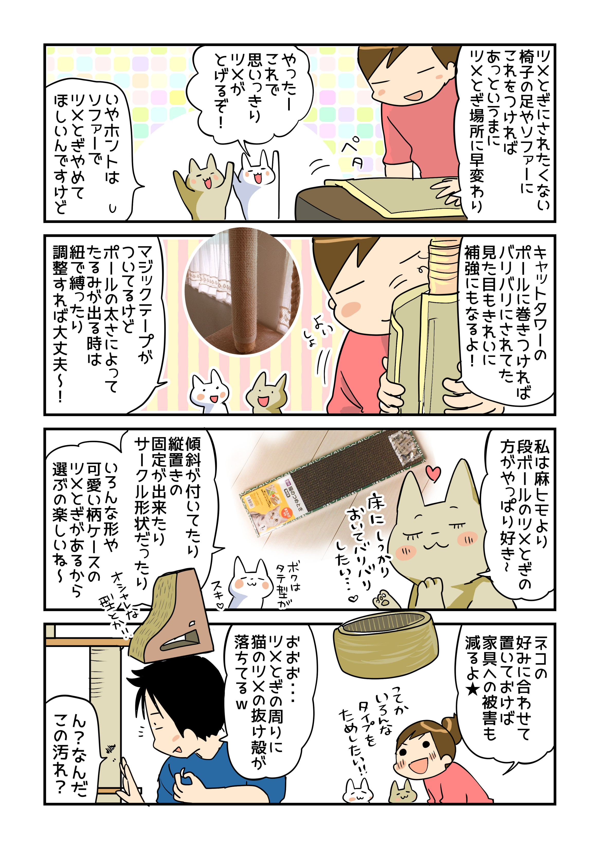 キャットタワーのポールは買い替えパーツがないものもありますが、今回紹介した「つめとぎマット」は、麻ロープを傷んだ柱に巻き付けちゃえば、爪のひっかかりが復活するから猫もよろこぶし、ボロボロも隠せてすっきりキレイに見えるので飼い主も嬉しいアイテムです☆