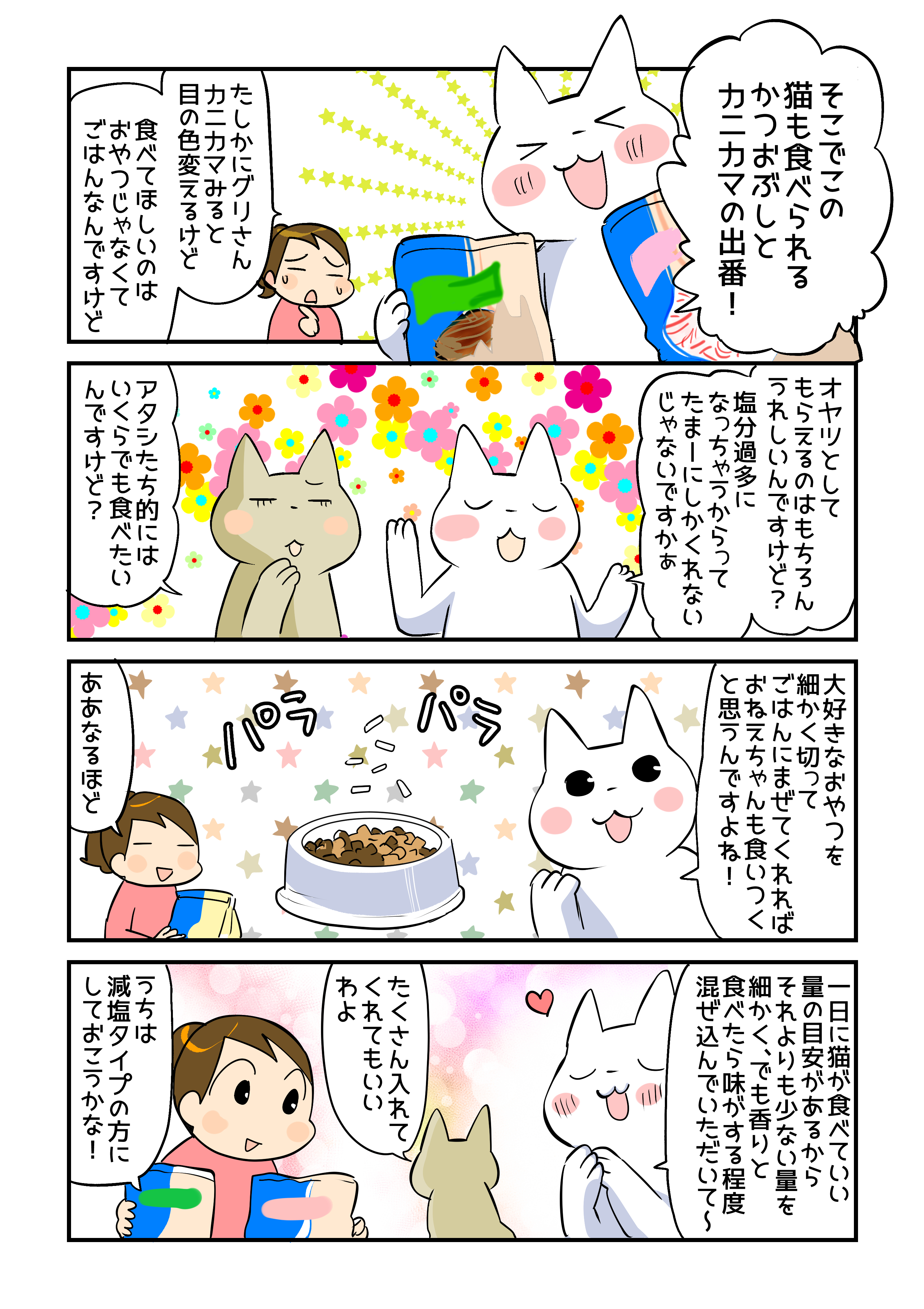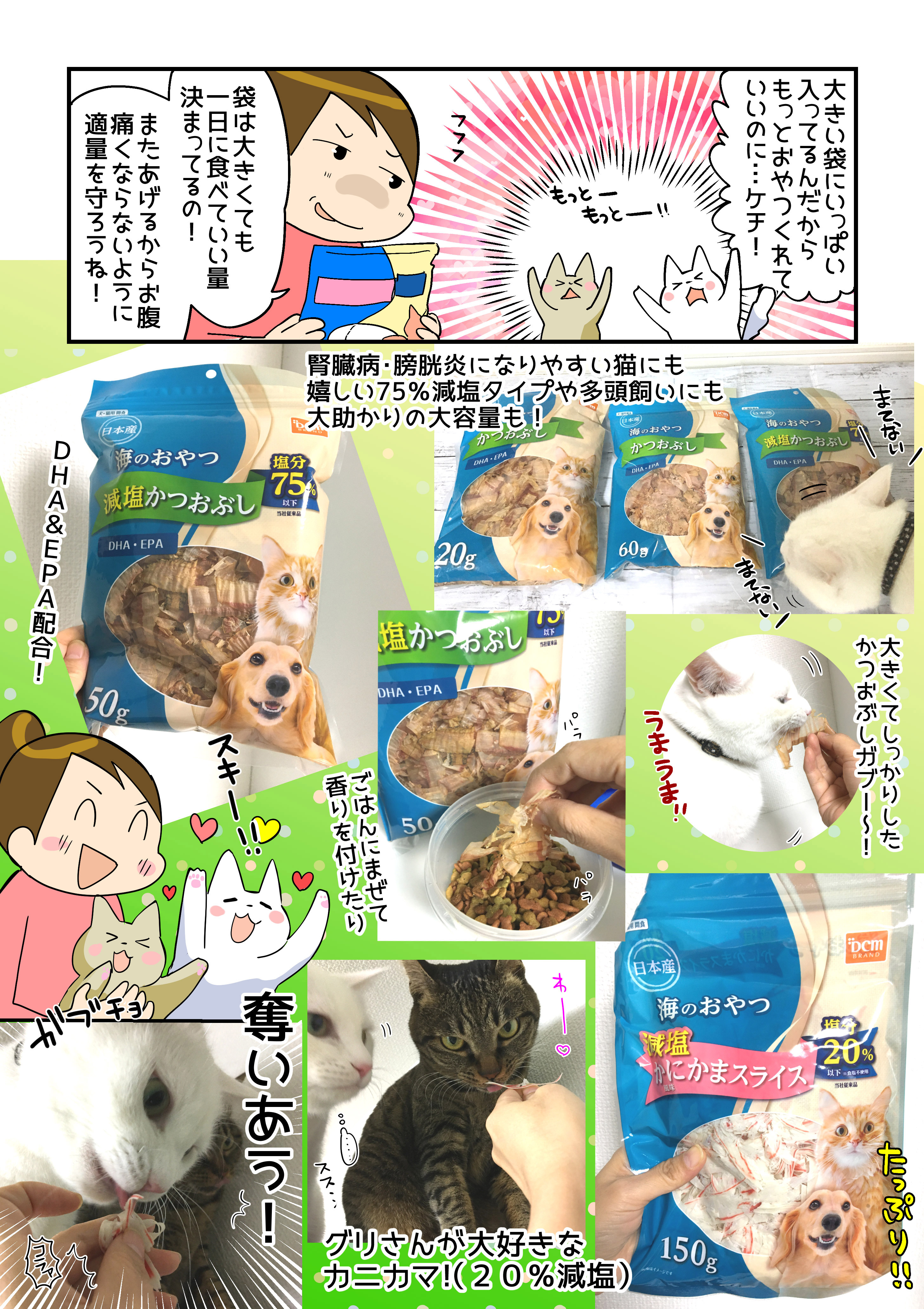 わが家の場合、猫たちのおやつをねだる姿が可愛すぎてうっかりたくさんあげそうになるので、毎回心を鬼にしないと大変です(笑)今回のおやつはかなりおいしかったようで、食べ終わってからも、いつまでも名残惜しそうに私の指を舐めていました(*^▽^*)多頭飼いのお宅にもちょうどいい大容量パックや、減塩タイプがあるのも嬉しいですね!ペットのおやつってお高いんですが、DCMさんの海のおやつシリーズはたっぷりサイズで、お財布にも優しいお得な価格…ありがたいです!あげすぎに注意しなくちゃ!(笑)