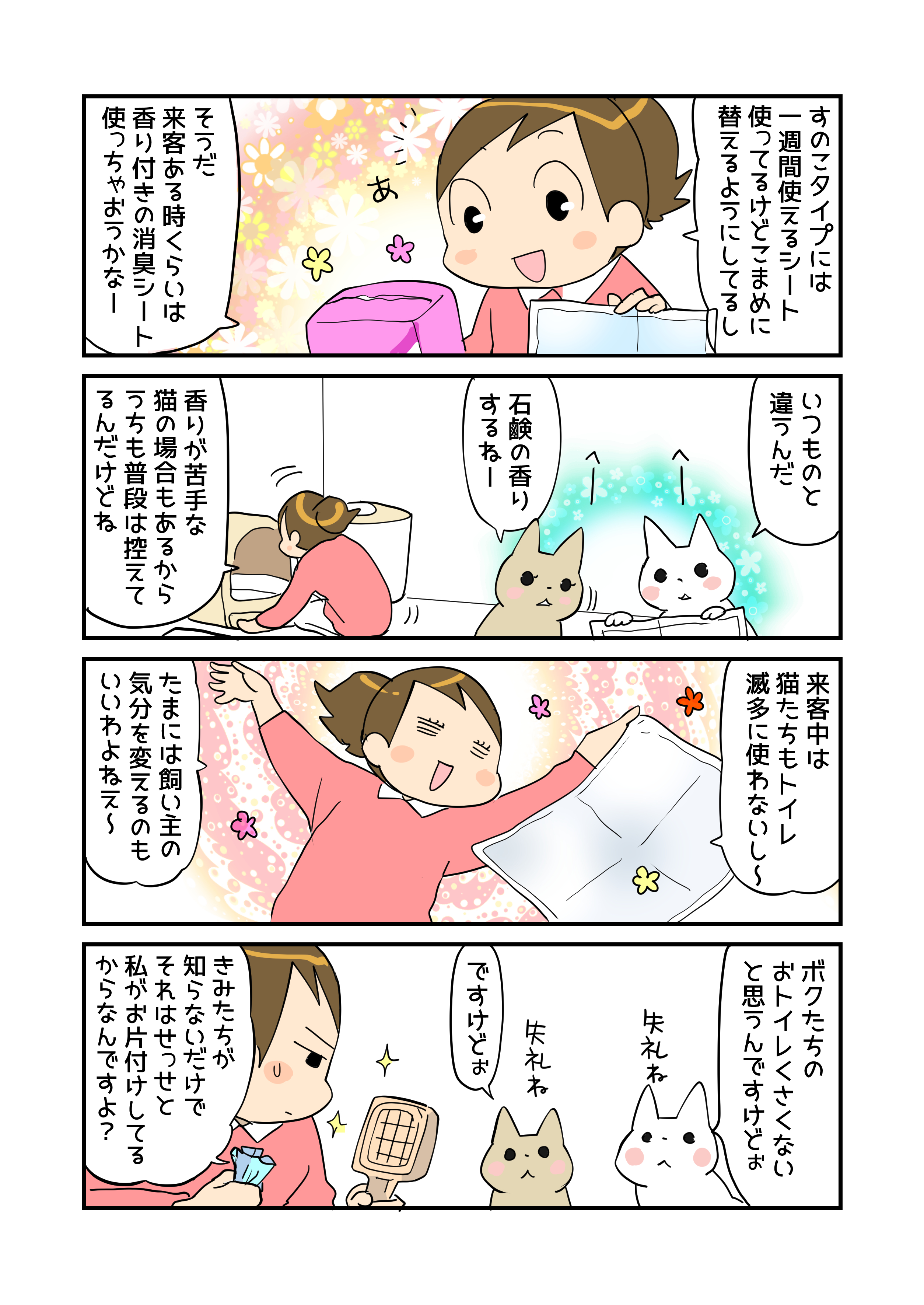 多頭飼いでも1週間交換がいらないシートは、たくさん用を足されたときやちょっとした外泊時にも心強いです!いろんな便利グッズを駆使して快適に過ごしたいですね!