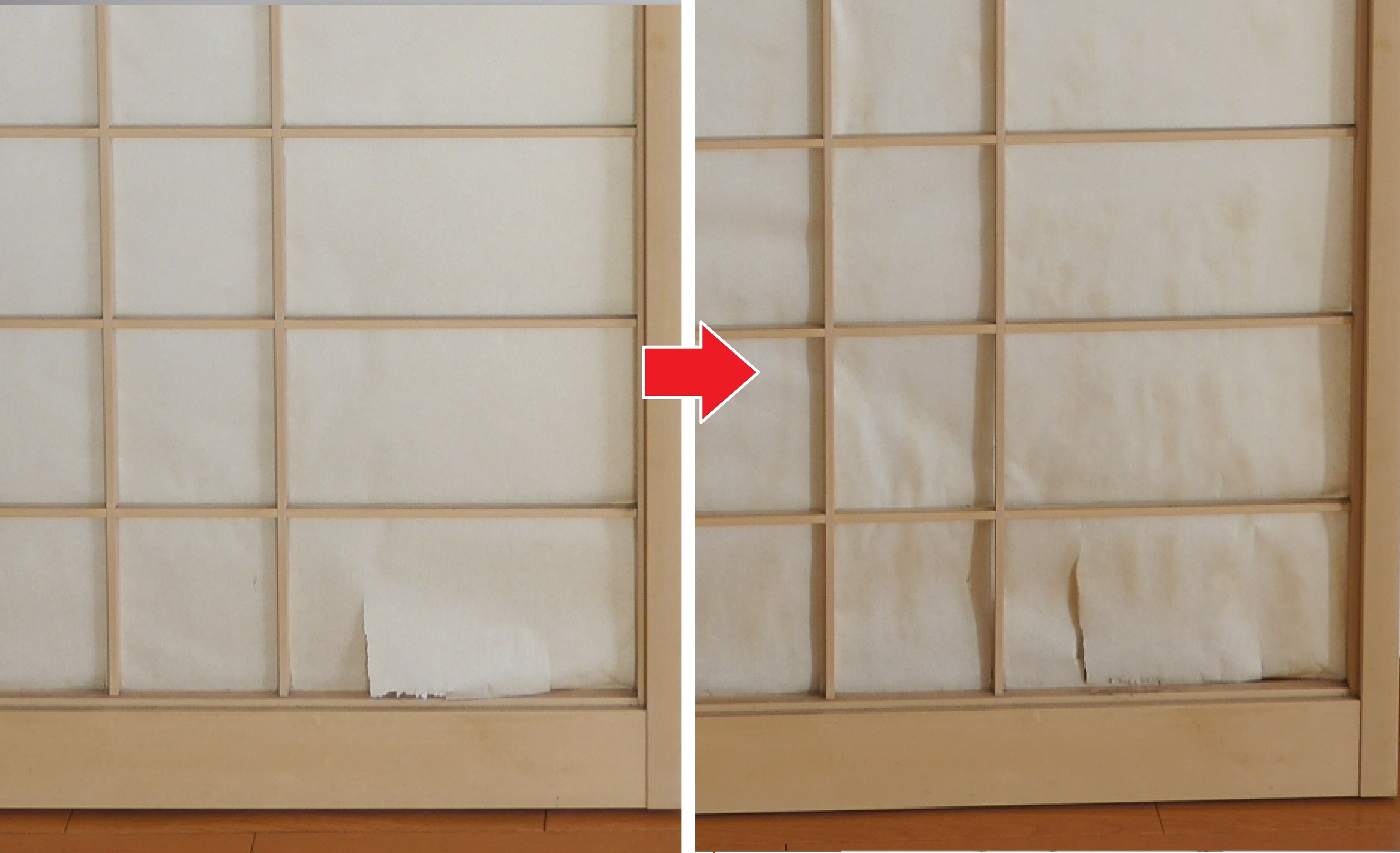 おおお! 白さがまぶしい! 見違えました!!のりで手がべたべたになることもなく漂白剤スプレーをかけて乾かしたり、ペーパーナプキンを切って、貼っての作業より早い。もしかしたら立てたままでも作業できそう。見た目は紙の障子紙なのに、プラスチックだから破れにくいのもGOOD!次のアイロン接着の障子紙は、テープを貼る手間がないからもっとラクなんですって!