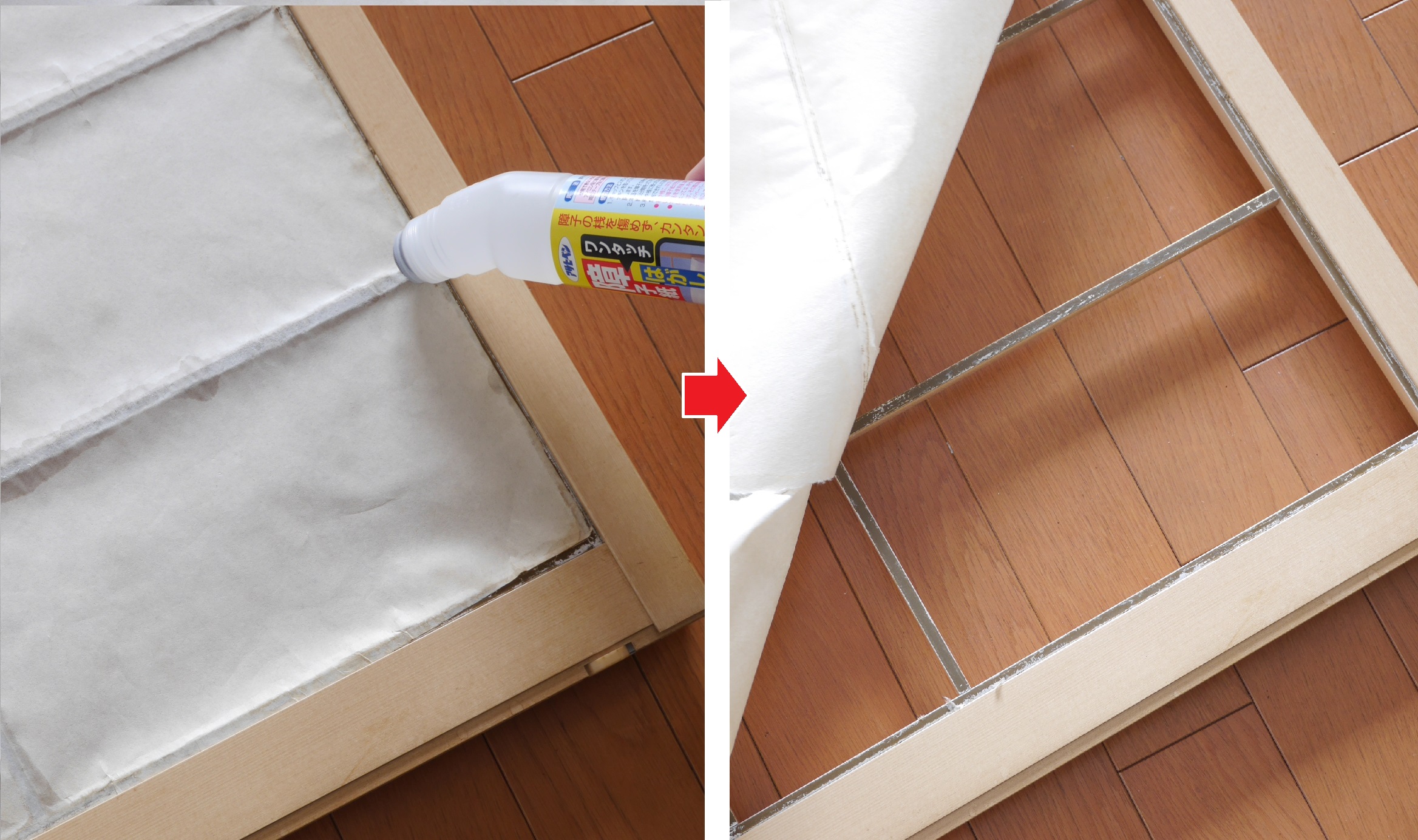 今どきは両面テープ貼りやアイロンで貼れる障子紙があるんですね。ワンタッチな障子紙はがしに、障子貼りかえ道具セットも調達。step1まずは古い障子紙をはがします。アサヒペン「ワンタッチ障子紙はがし」を裏からたっぷり塗って、そのまま5分。