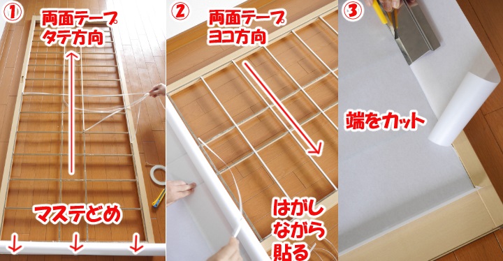 手順は①障子紙と障子が平行になるよう位置決めし、マステで仮止め。桟に専用両面テープを縦方向に貼り、紙をはがす②桟の横方向に両面テープを貼り、1段ずつ紙をはがしながら障子紙を貼る。③端の余分な障子紙を定規をあてながら切り取る。