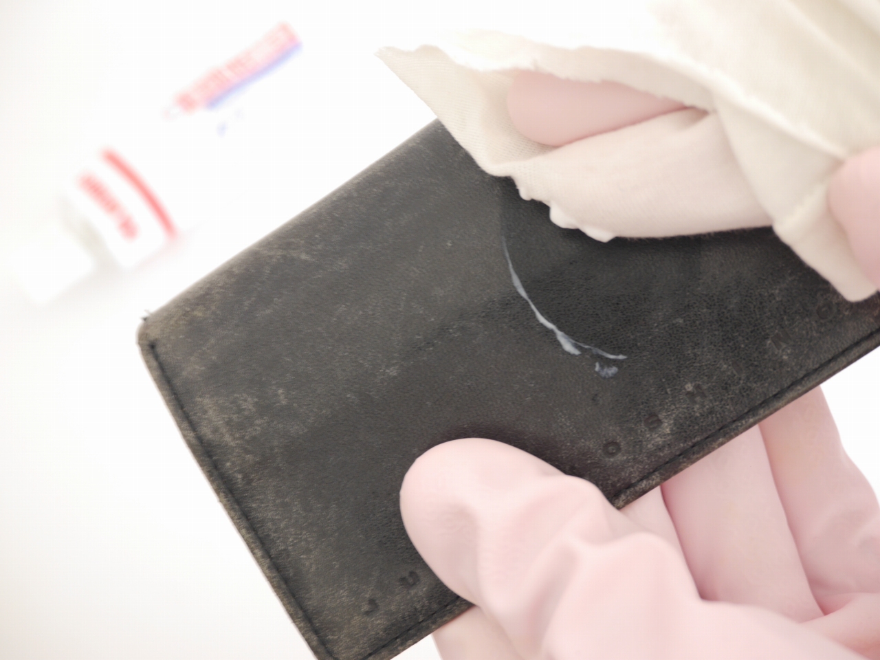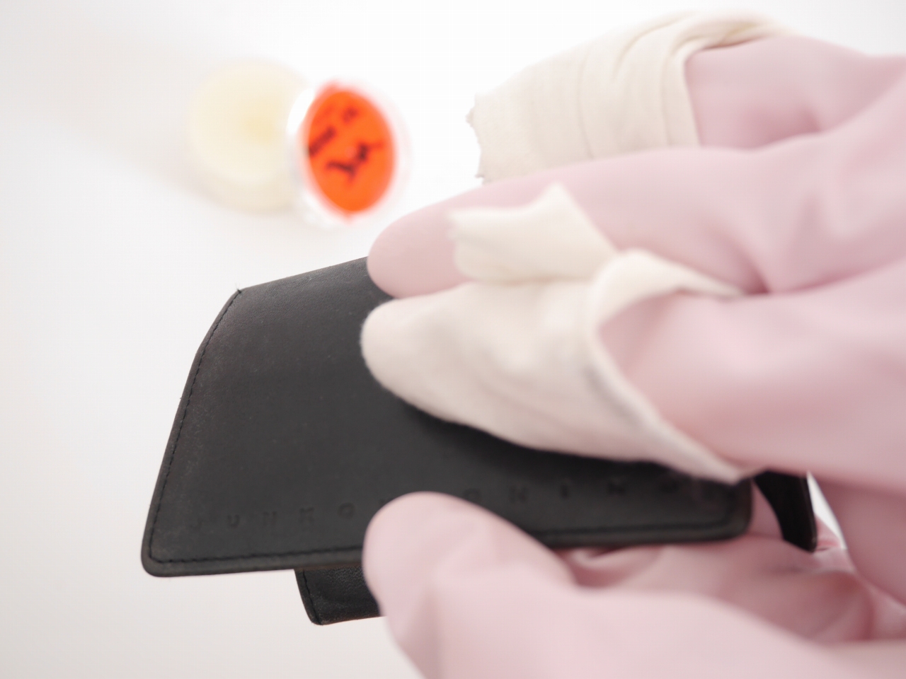 表面のホコリをざっと拭き取り、レザークリーナー少量を柔らかい布に取って拭いていきます。おっと、ひと拭きでいい感じの黒がチラ見え!使用したコロンブス「ニューネオクリーナー」はワックス成分なし、なのにこの感じ。期待できます!