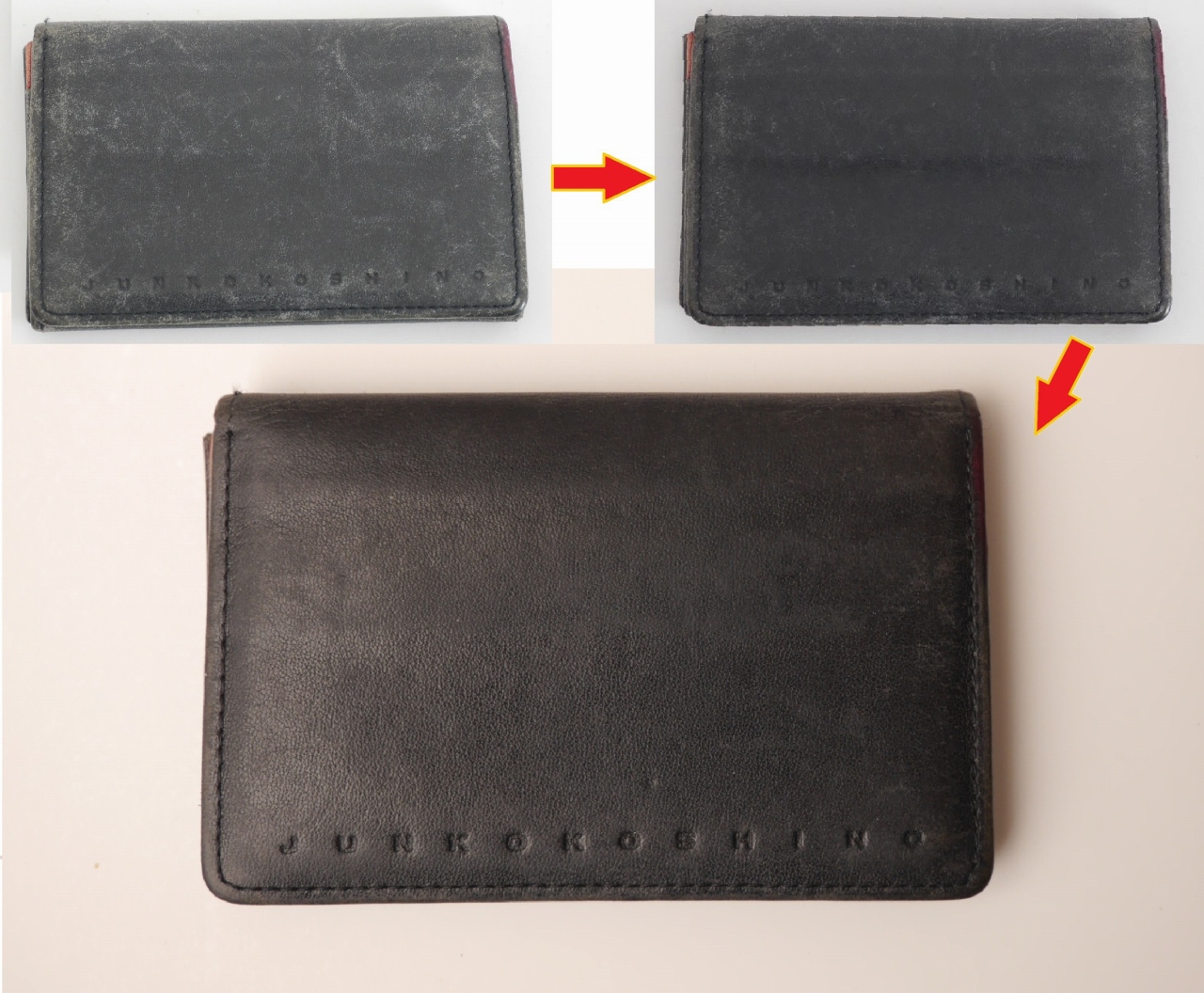 そこそこきれいになってくれた気がします!ただしカード入れ一段目、砂消しゴムを使った部分は見事に白っちゃけてしまいました。反省です。「砂消し」「消しゴム」「メラミンスポンジ」とも「革の表面加工を削り、寿命を短くする行為」とのことで「使っちゃダメ」とするサイトが多かったのであしからずです。