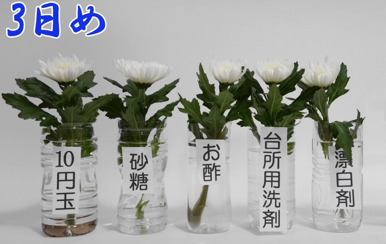 「お酢」「台所用洗剤」「漂白剤」のしおれ方が加速。いっぽう「砂糖」の菊は、ひときわ大きく花が開いて超元気。