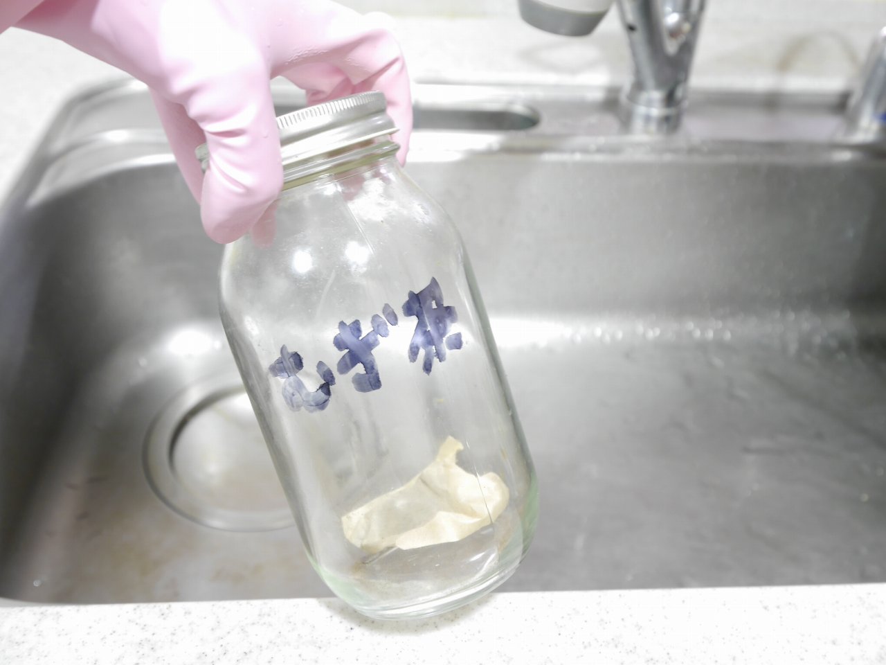 さわるとざらざらしてます。拭くだけでなく、「水洗い」「絞る」「洗剤をつけて泡立てる」なんかもこなせるそう。ますはどれだけ油に強いのかテストですよ。「油性ペンの文字を水だけで落とせる」とあったのでわが家の麦茶ビン、どうかしら?