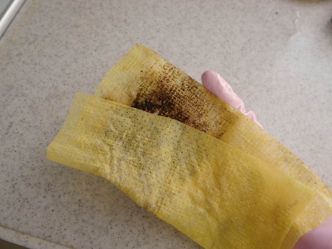 よし、傷もついてないし溶けてもない!雑巾を使ったときのような繊維残りもない!しっかりピカピカしてます。いいね!!がっつり拭きまくってドロドロになっても、裏側はきれいなので、両面ムダなく使いきれるのもいいです。