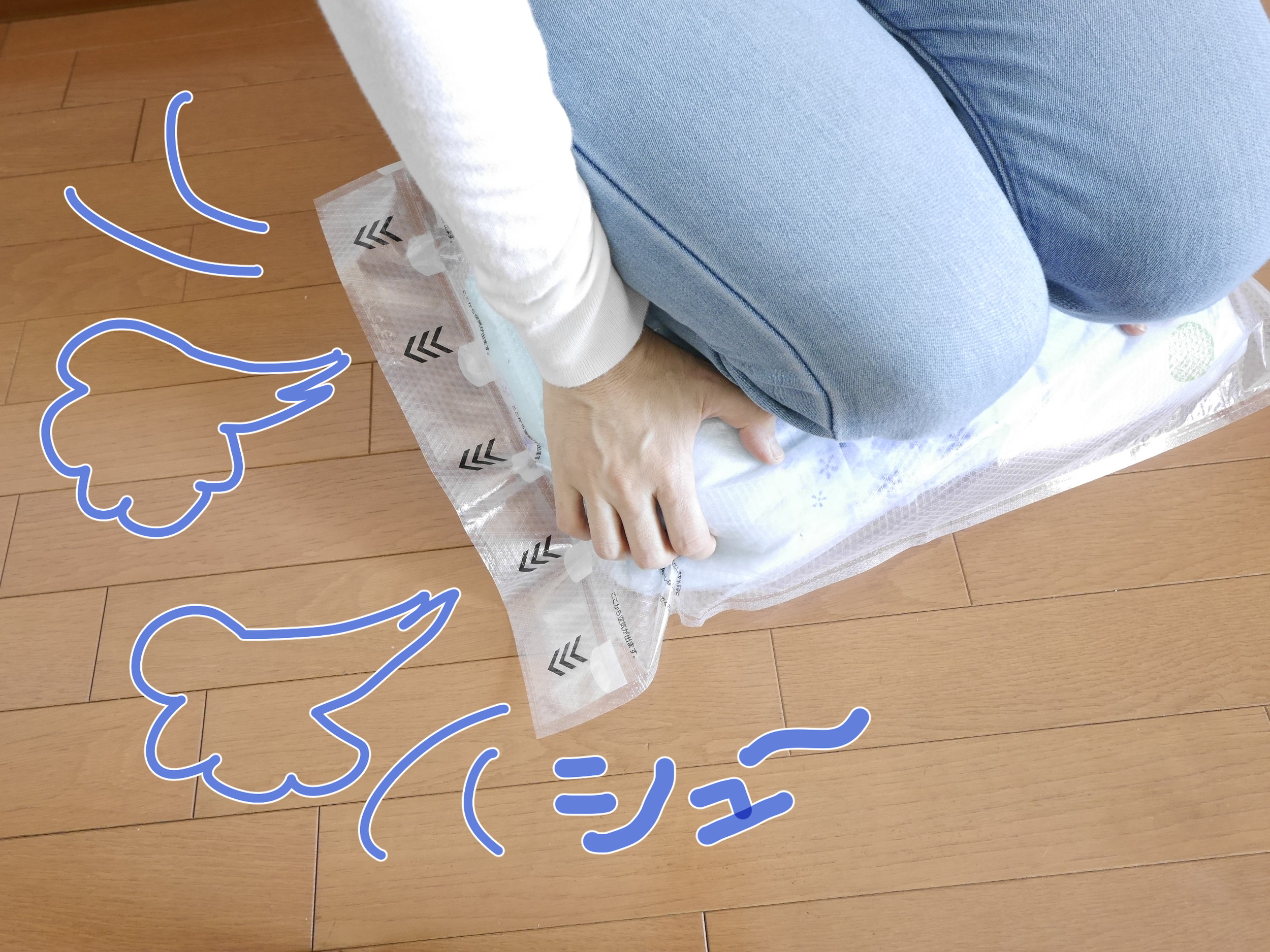 空気は>>印のところから逃がすため、掃除機による吸い出しはいらないそうです。不思議。さっそく布団入れてみよう!と思ったら、なんか小さくない?
