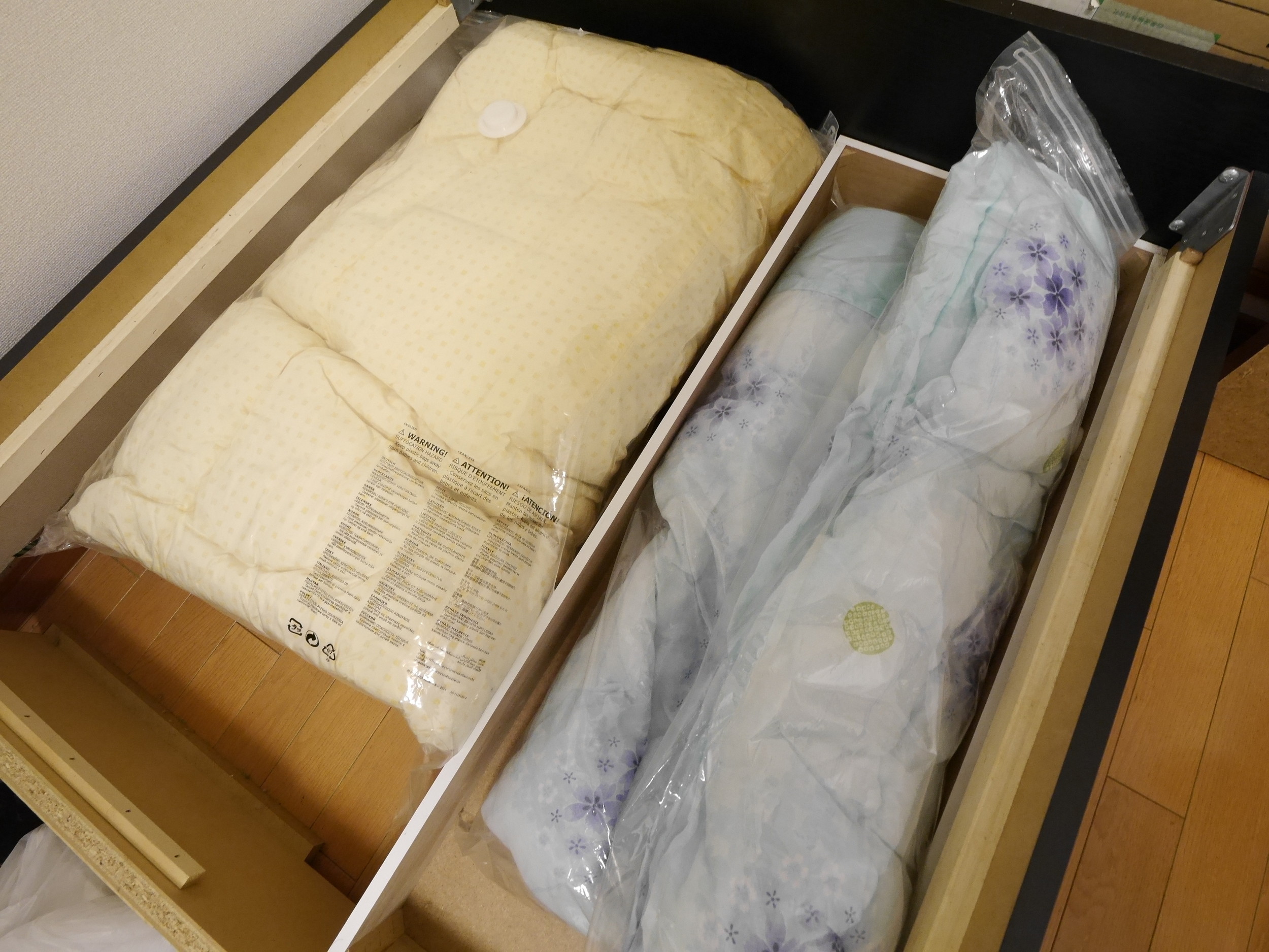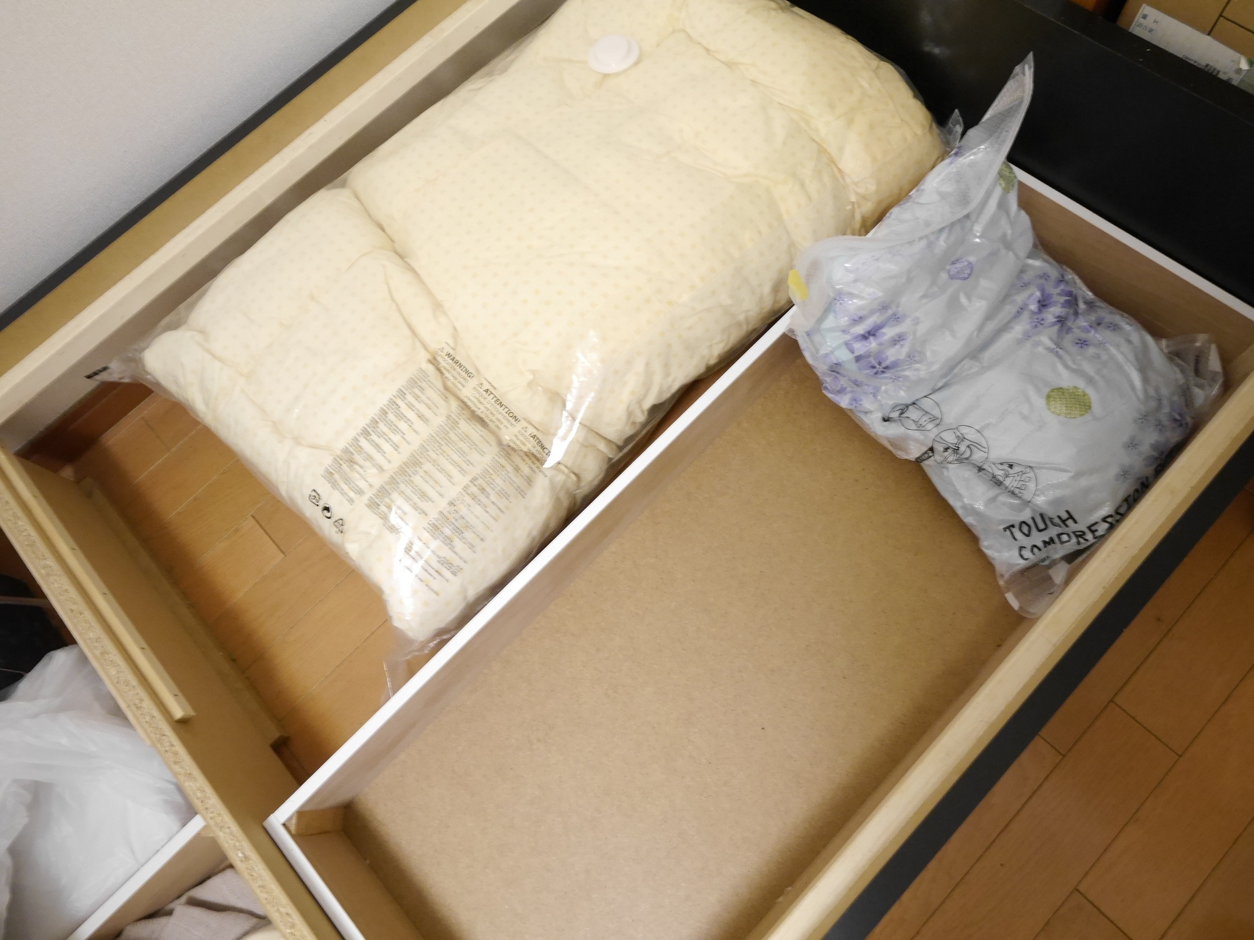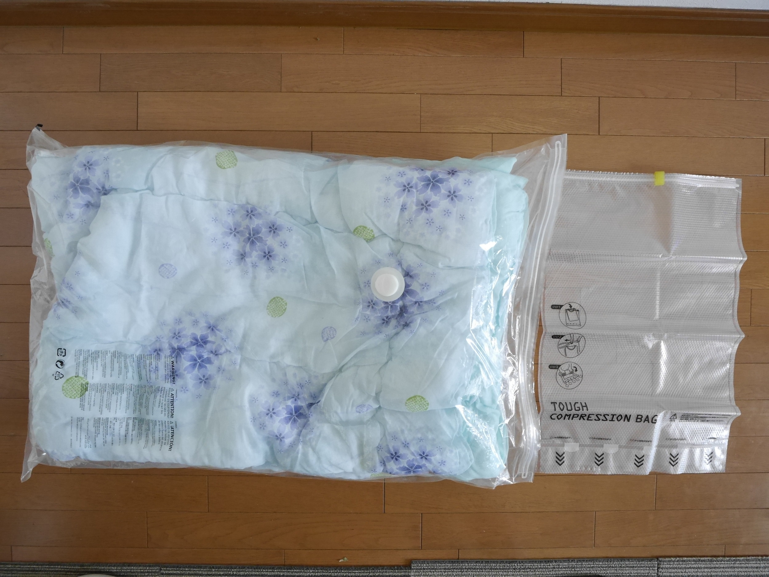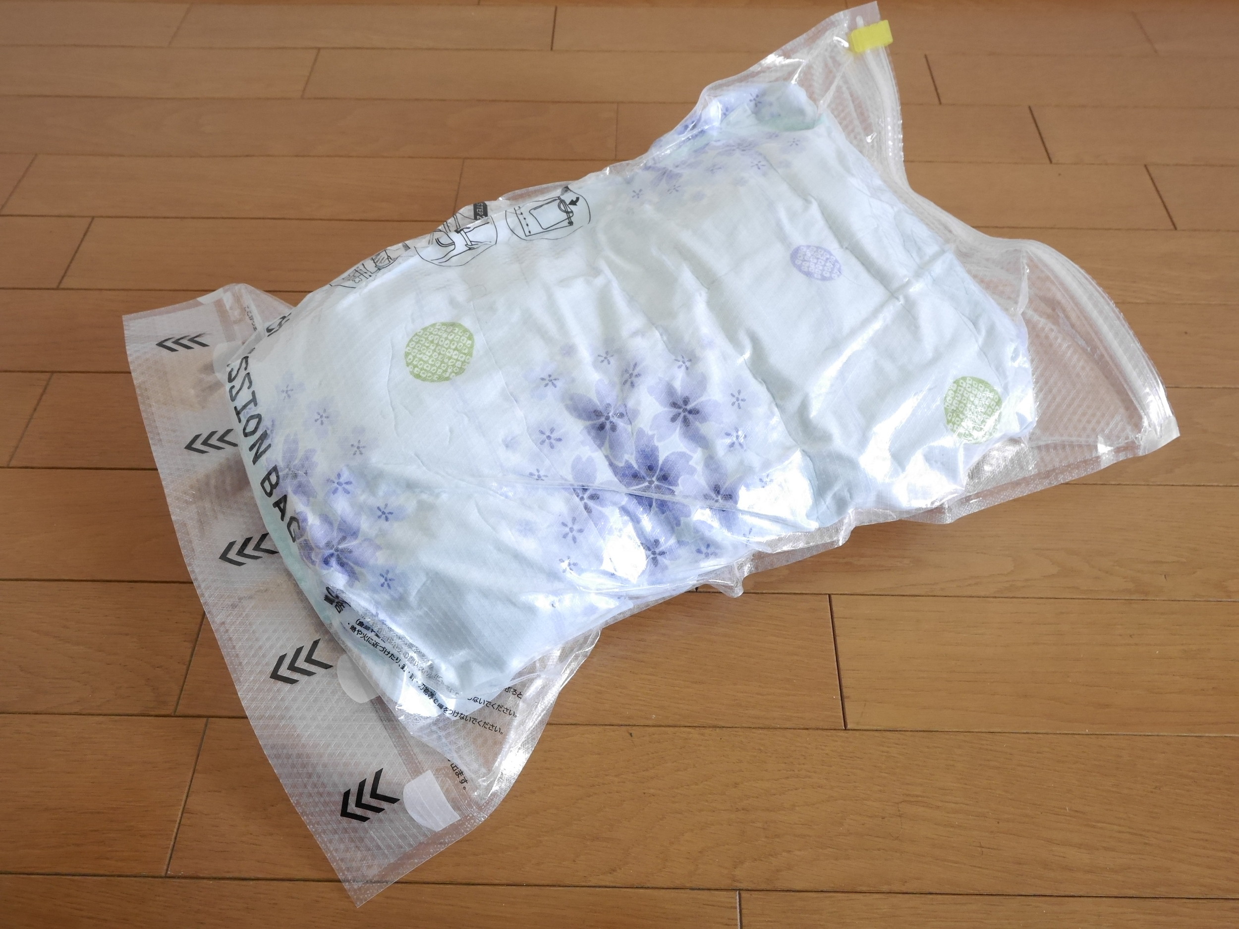 かさばる布団や衣類やらをキューッと圧縮できる「圧縮袋」。使ってます?うちは毎年、布団収納に掃除機で空気を吸い出すタイプ、たしか2枚で299円のを使っておりますが、取り出す頃にはこのとおりふっくら。圧縮袋というよりホコリよけ袋状態です。