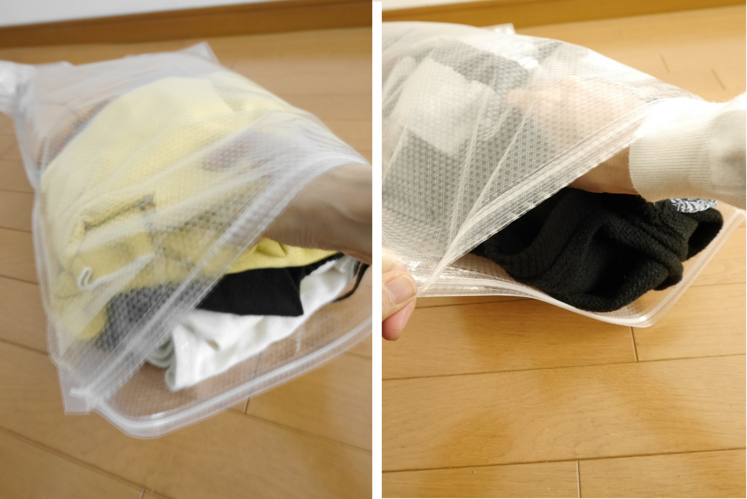 めっちゃ小さくなった!もう5枚くらいしまえそう!あとはこのままほっといて、本当に圧縮状態をキープできるかですが、検証には半年かかるので本来の用途である「衣類」を試してみます。
