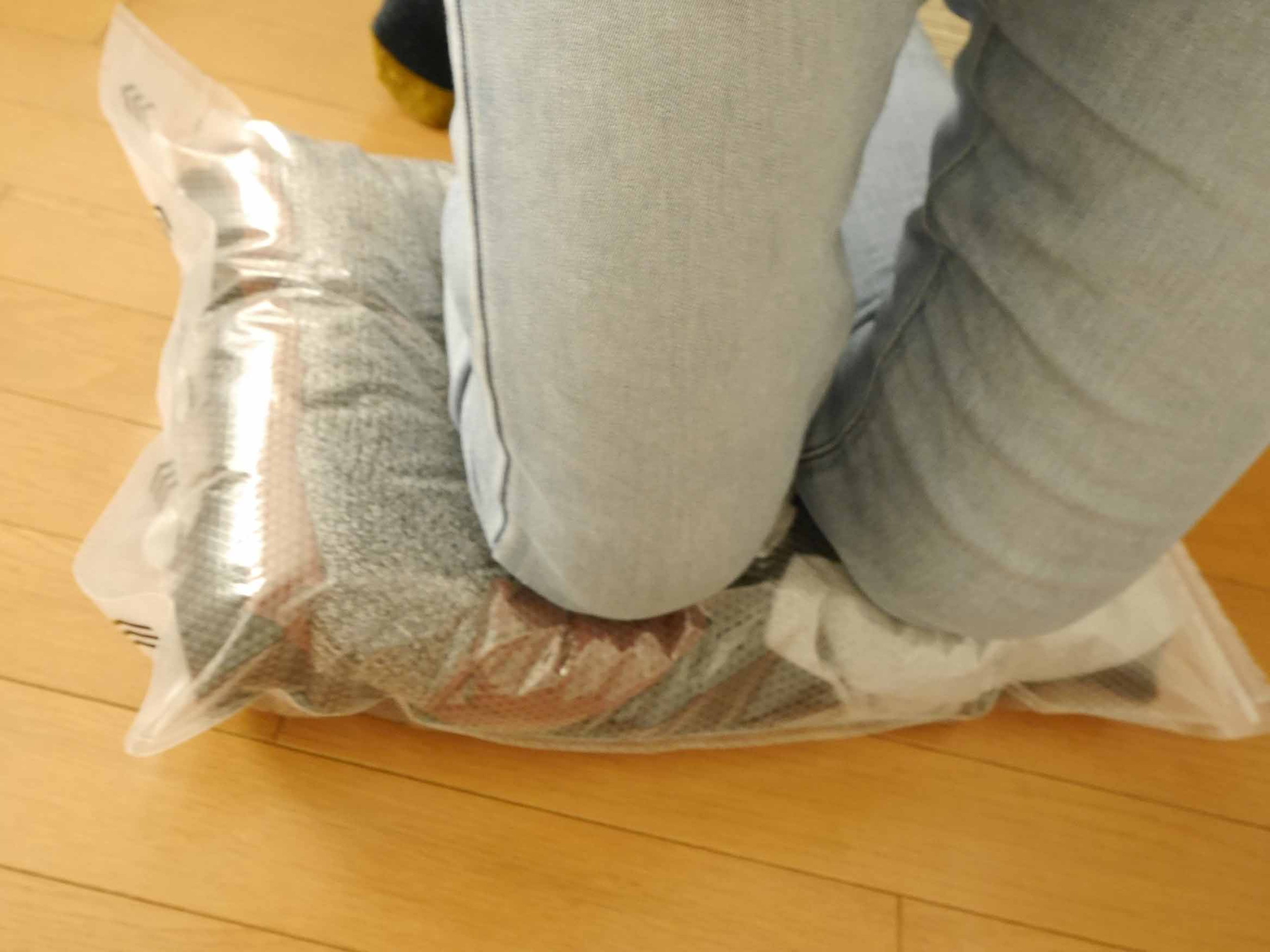 62×40cmサイズの圧縮袋2枚に、計18枚のニットをイン。頑丈なのでけっこうイケる! てかもう何枚かイケたね!※あくまでチャレンジ企画です※閉じたらこんどは膝でグイグイ空気抜き。