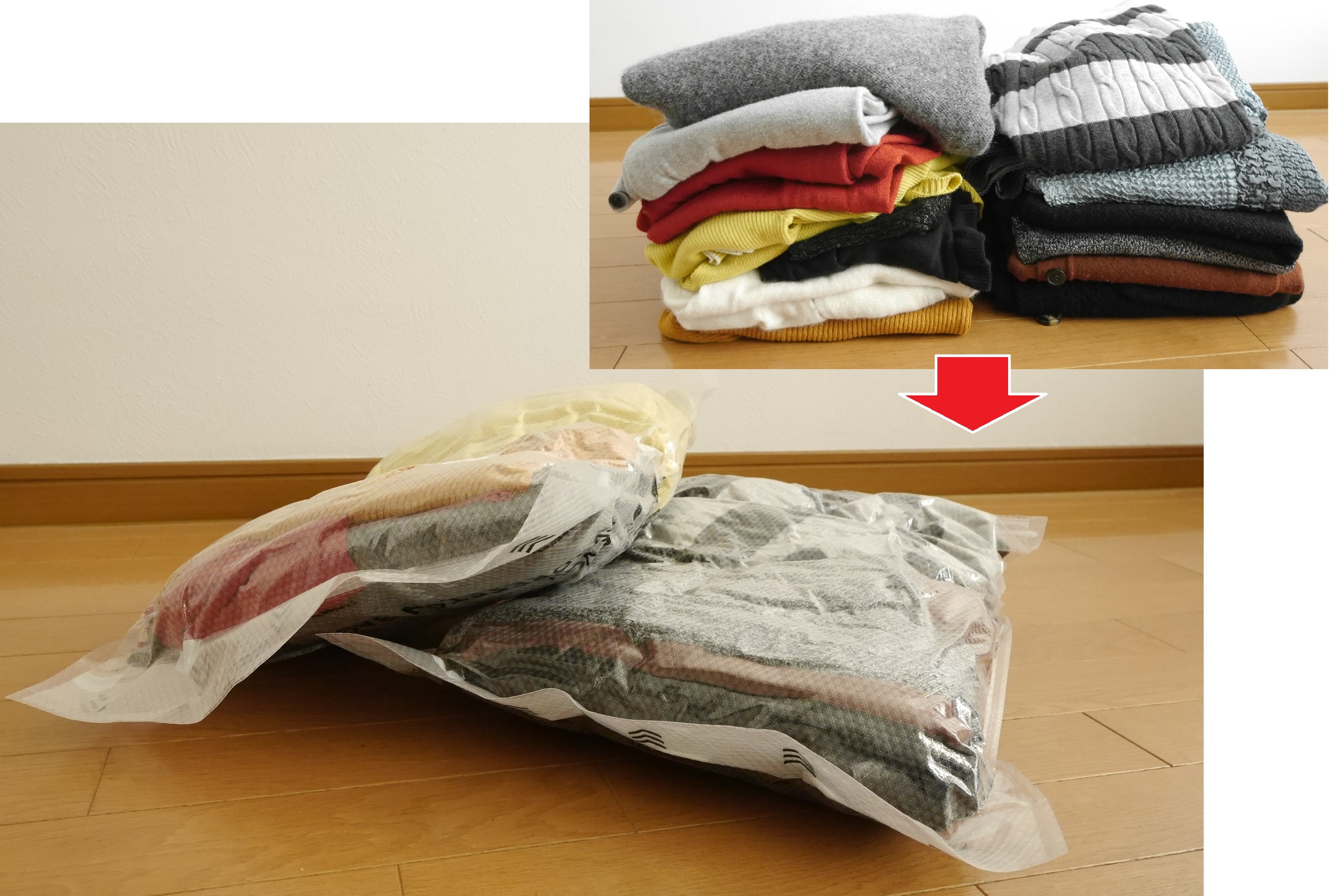 大量のニットが、ソファー下のスキマにおさまってしまったという!衣装ケースまるまる1個ぶんのスペースが浮いた計算です。ありがとう圧縮袋!体重さえあれば大量の衣類を圧縮できるってステキすぎる!そしてひらめいてしまったわたくし。