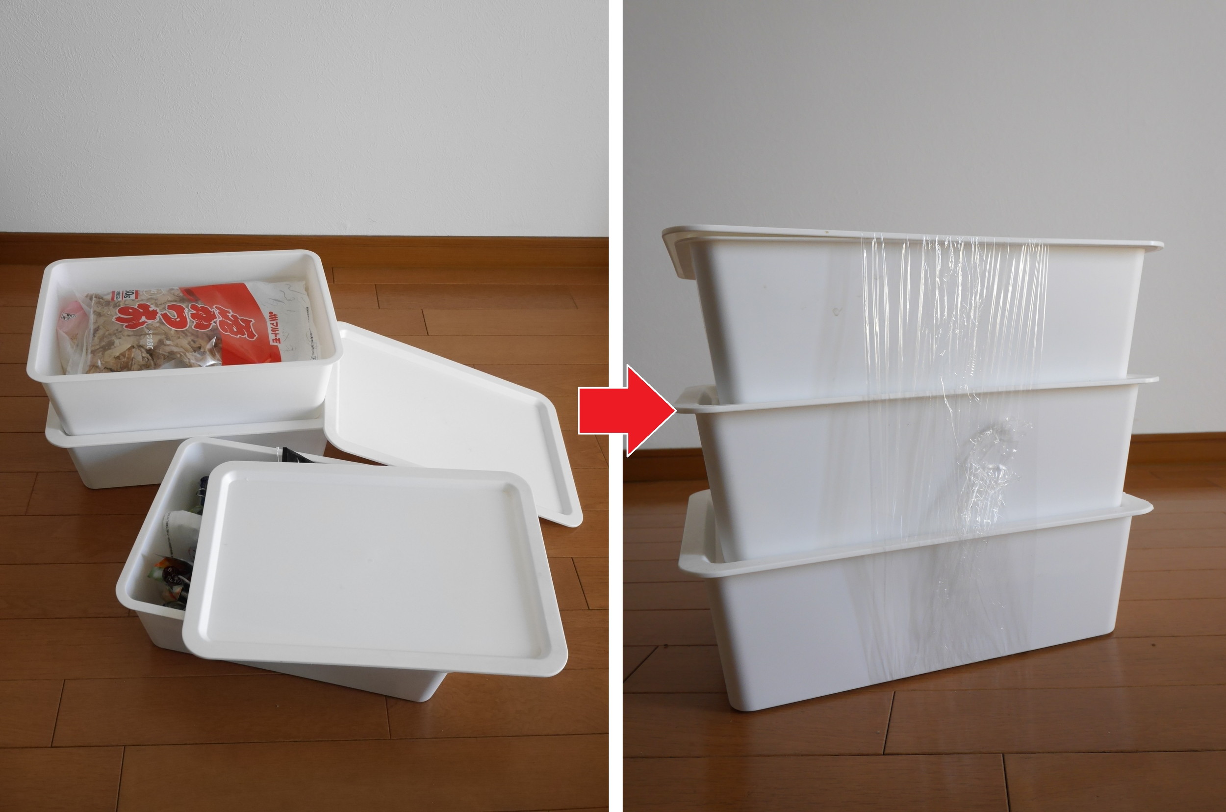 まとめるだけでなく、「固定」にも役立つということで乾物入れに使っていたスタッキングボックスを上からグルグルしてみます。フタが固定されないタイプなので、中身を出して梱包する必要がありましたが中身入りのまま運搬OKになりました。