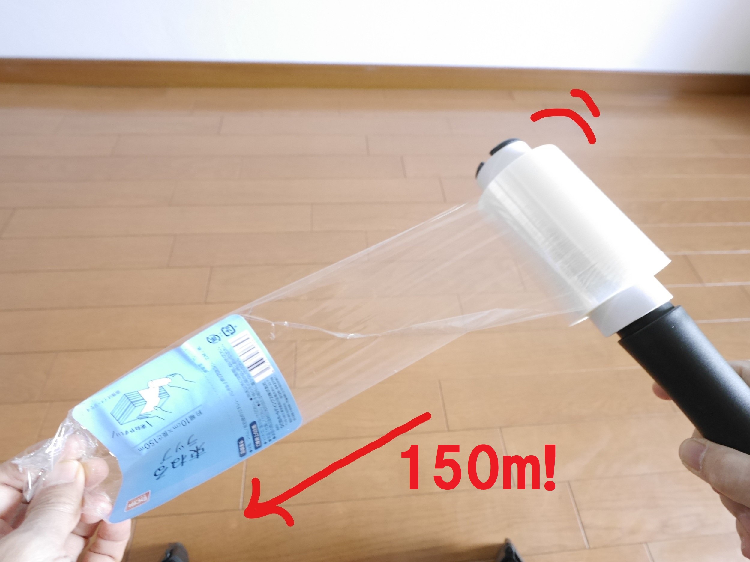 ハンドルの先端に10cm幅の透明フィルムがセットされており、引っ張るとクルクル回って引き出せます。「まとめ」作業のほか「固定する」「保護する」などを簡単にしてくれるそうです。