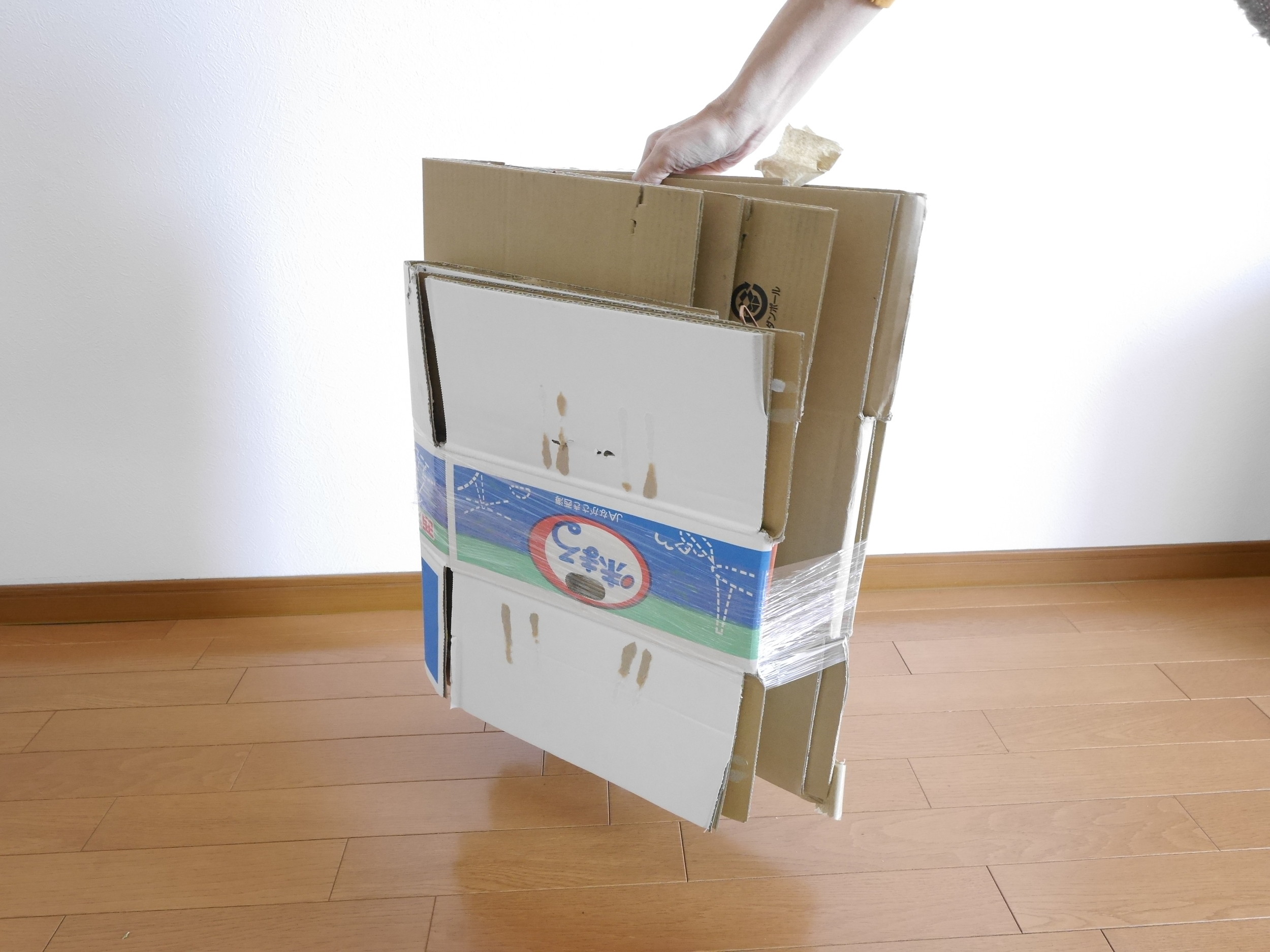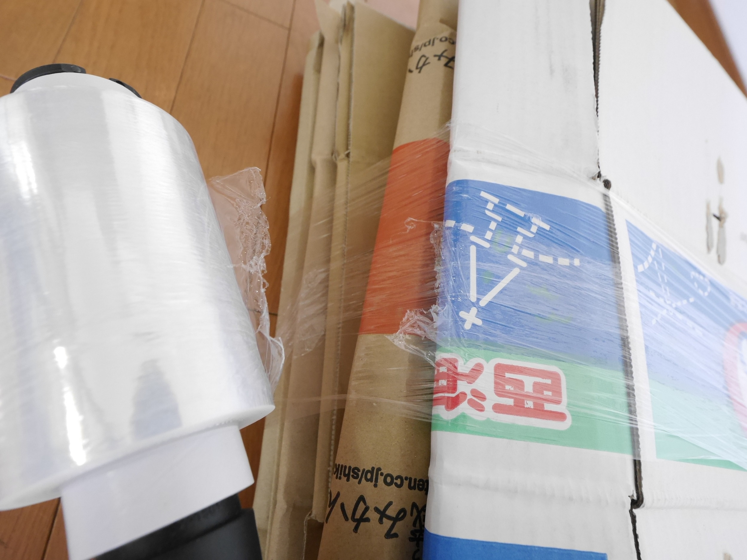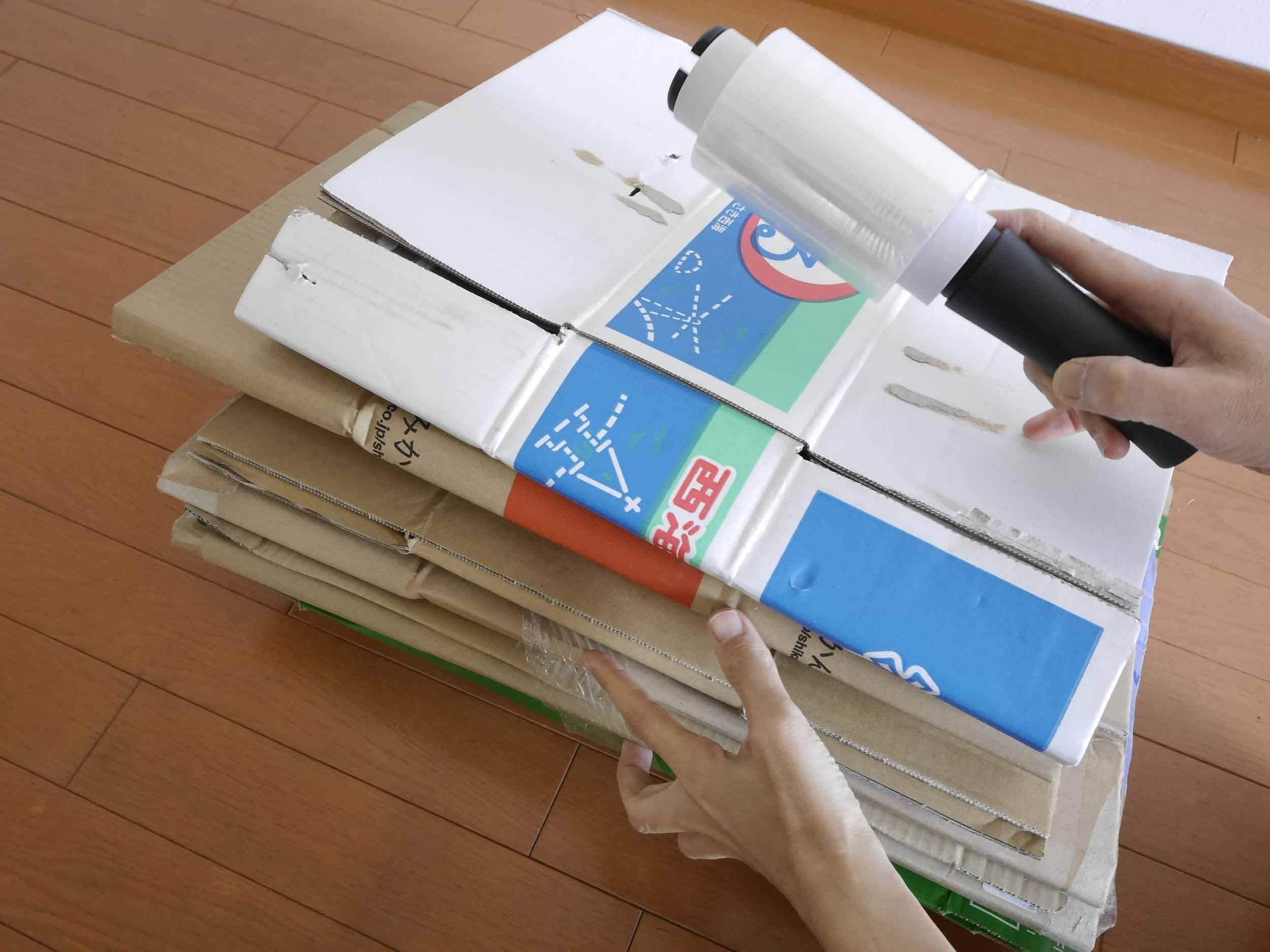 まずは「まとめ」作業から。引っ越しで大量排出される段ボールをくくってみましょう。段ボールを適宜重ね、間にフィルムの先端をはさんでぐるっと一周。