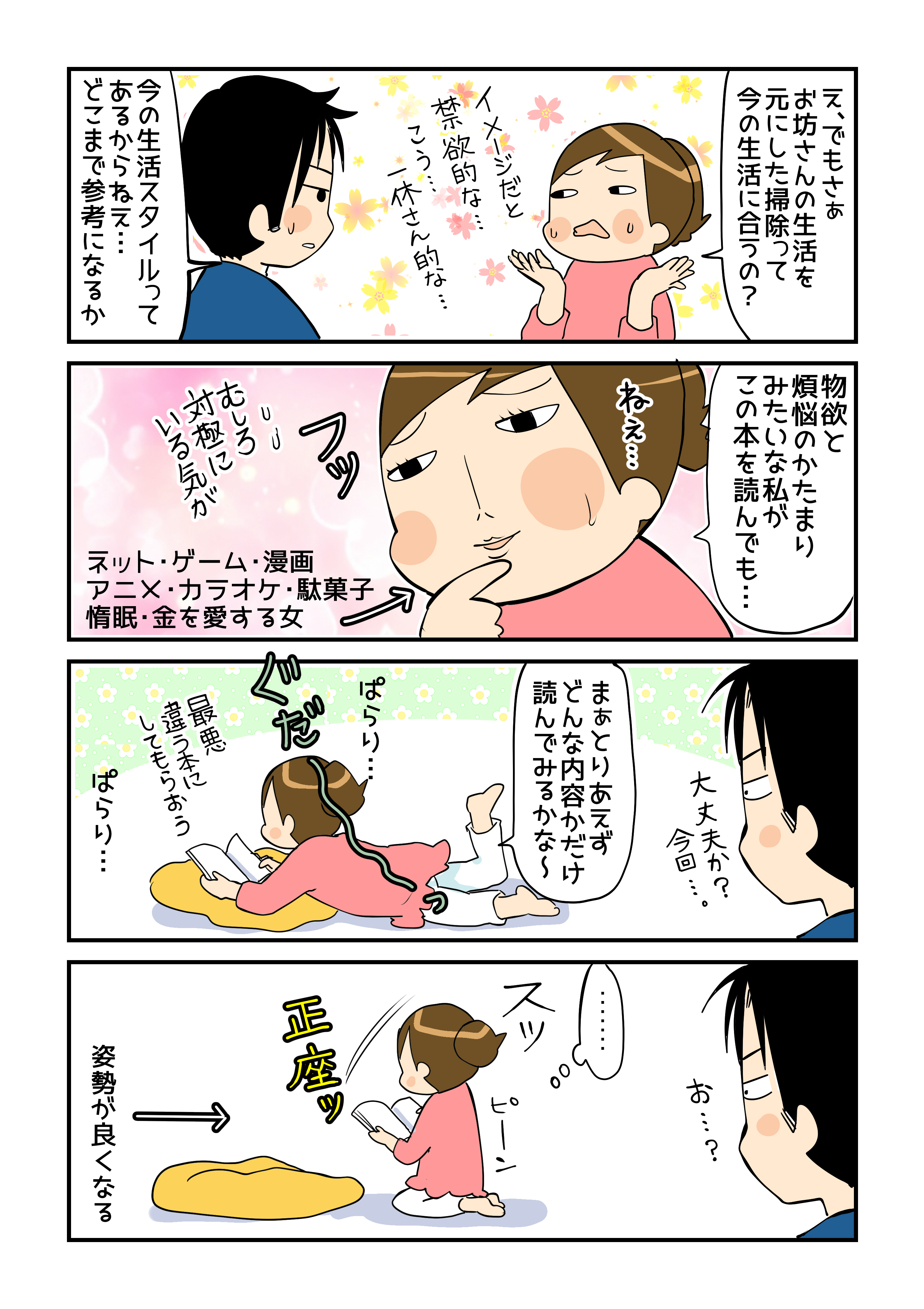 掃除のテクニックやハウトゥー本というよりは、お説法本かなと思います。 ダラダラとした自分を自覚している時にも読み終わった後には、なんとなく背筋がピンと します。 空間の乱れはこころの乱れ、という言葉を頭にいれておくと、散らかった部屋を見て「あ、 やばい、やばい」と重い腰を上げるのをちょっと手助けしてくれます。 禅やお坊さんの生活に興味がある人にもかなり面白い本だと思いますよ!