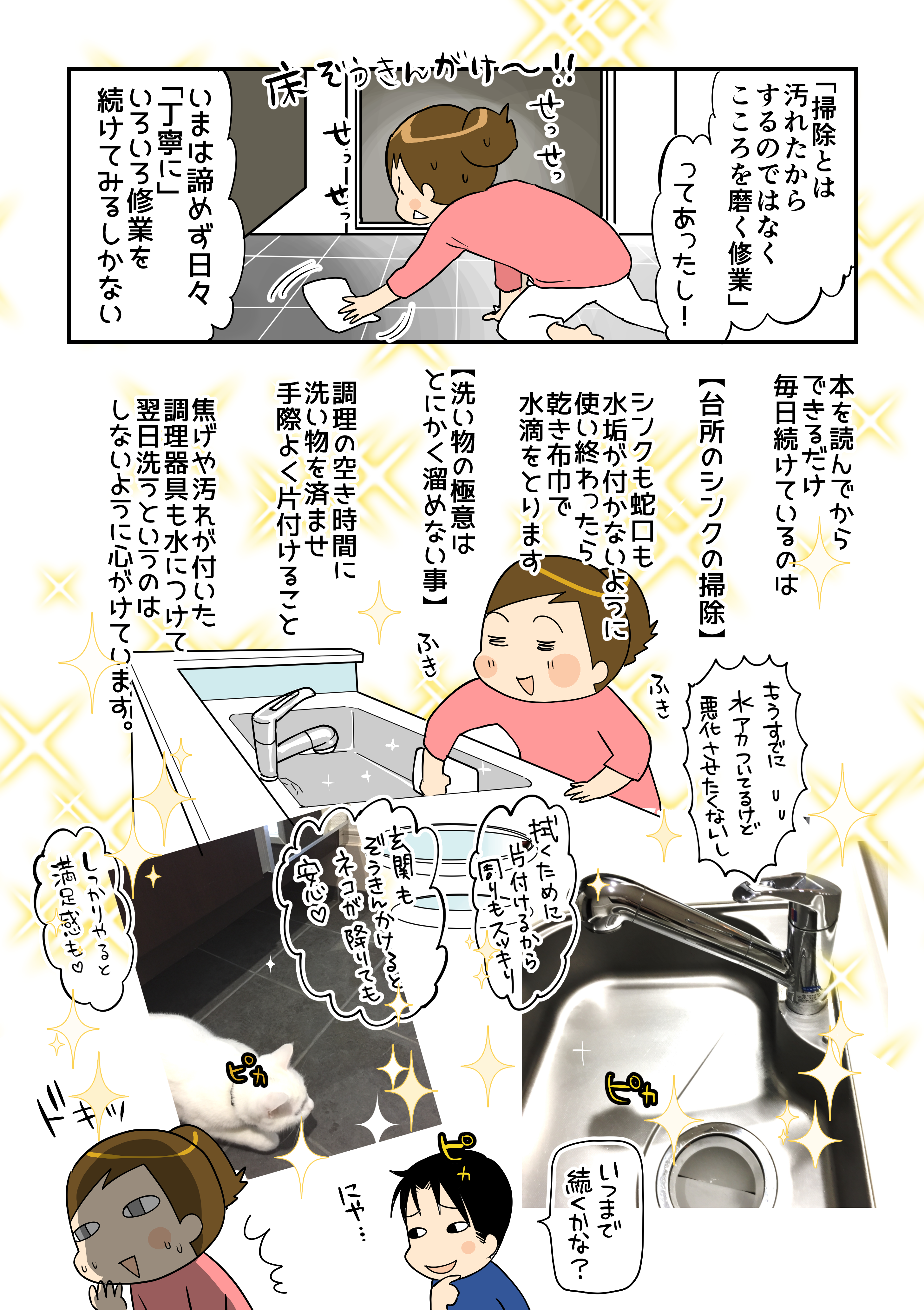今回の本は僧侶の方の描かれた掃除の本です。僧侶の方々と一般主婦とでは、日常生活そのものも違うので、実生活において本著のようには動けないなあ、と思うことも正直たくさんありました。掃除のテクニックを学ぶというよりは、掃除と向き合う時の気持ちを重視して読ませていただきました。掃除や片づけ、料理などの家事修業をしていると、本当に身につくのかなあとか、理解できているのかなあとか、みんなはできてる、やってることなんだから私もちゃんとやらなきゃ。。。と思ったりして、自分に不安 になったりもするんですよね。できるところからでいいから、少しずつ丁寧にやってみよう、続けてみよう、と前向きになれた修業でした。