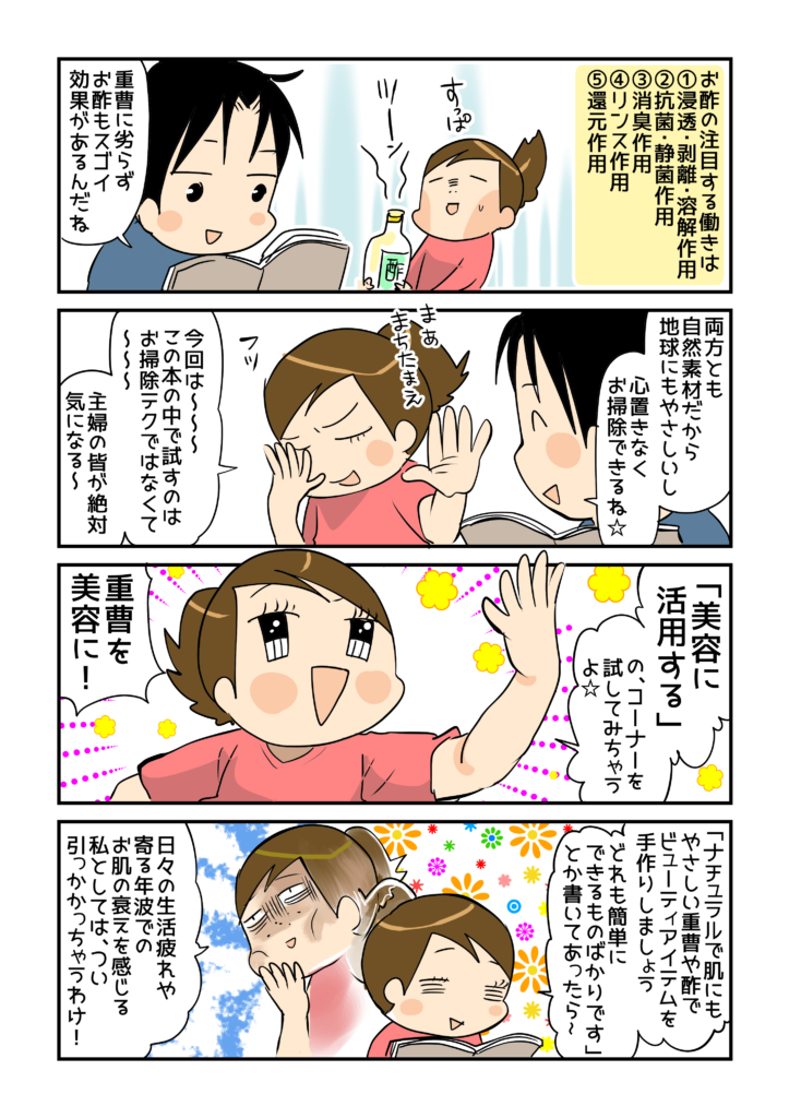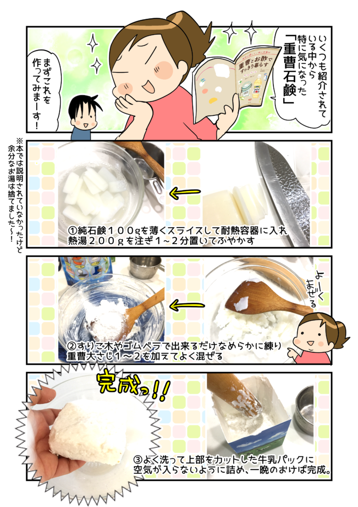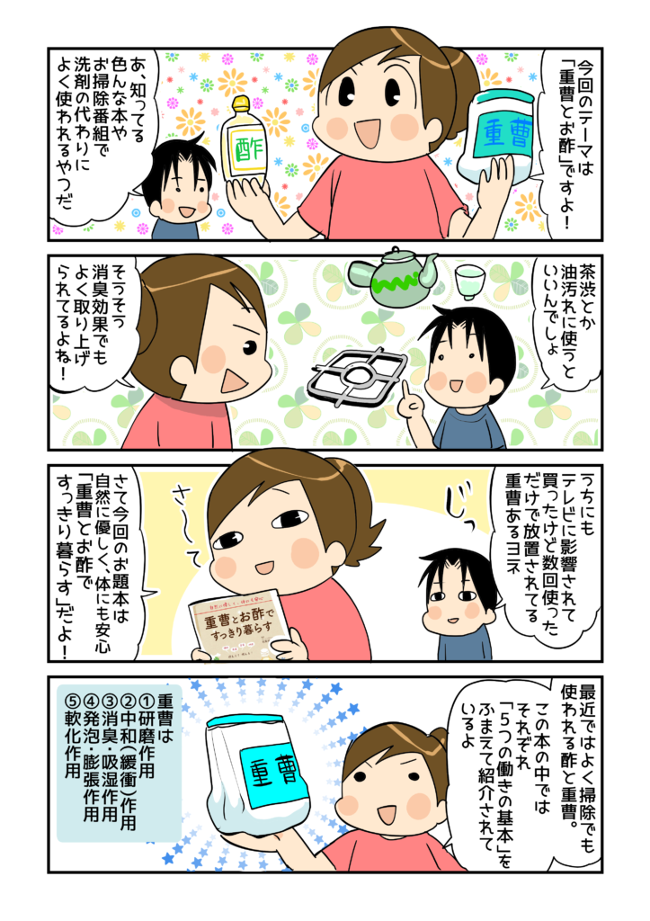 記事の中では触れていませんが、重曹やお酢をつかった掃除の仕方、くらしのアイデアもとてもわかりやすく、無駄がない。たくさんの情報が掲載されています!これまで、難しいこと嫌い!とか、 合成洗剤じゃなくてもホントにしっかり落ちるの~…?と思っていた人にも、とっつきやすい一冊かと思います(*´▽`*)